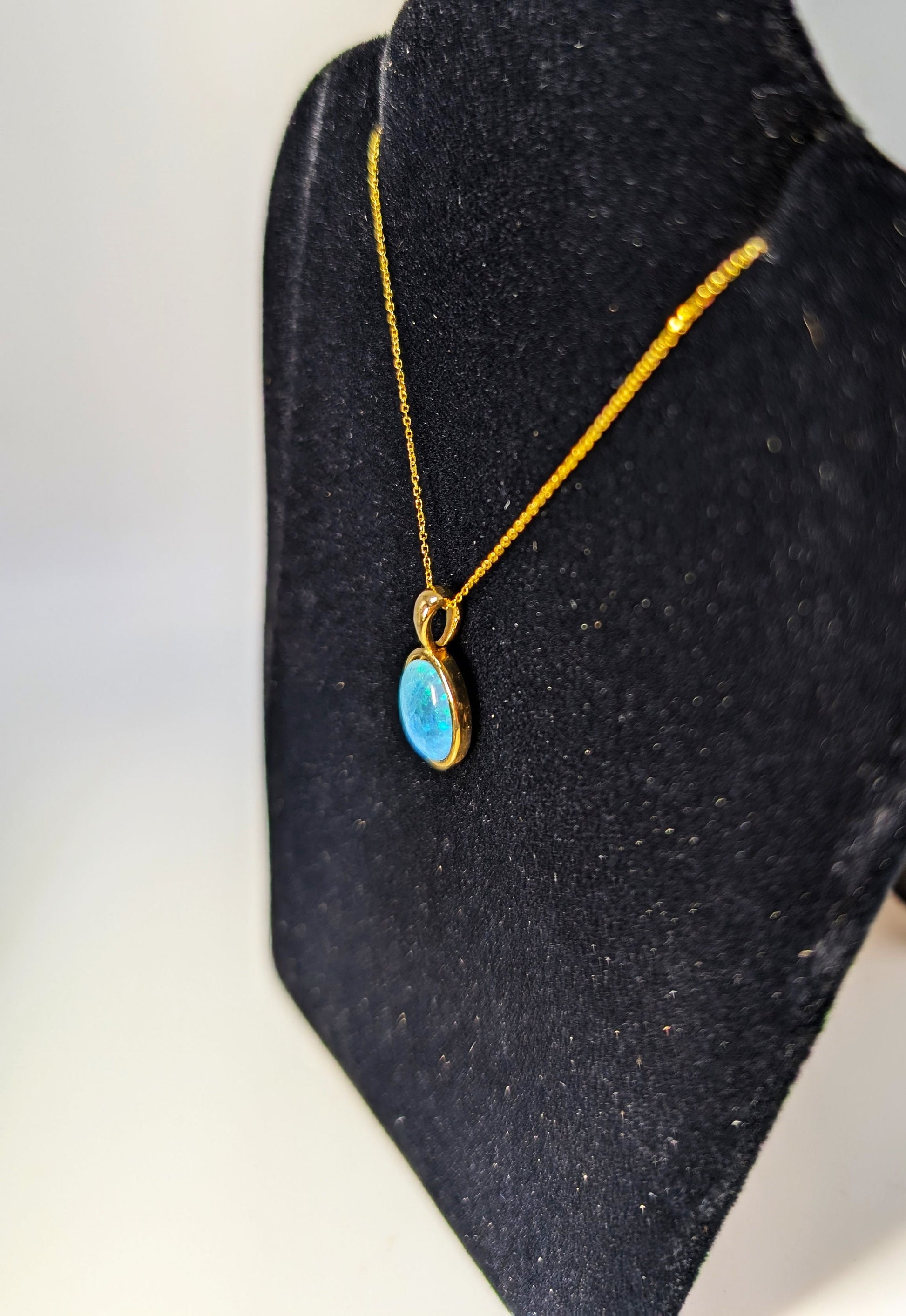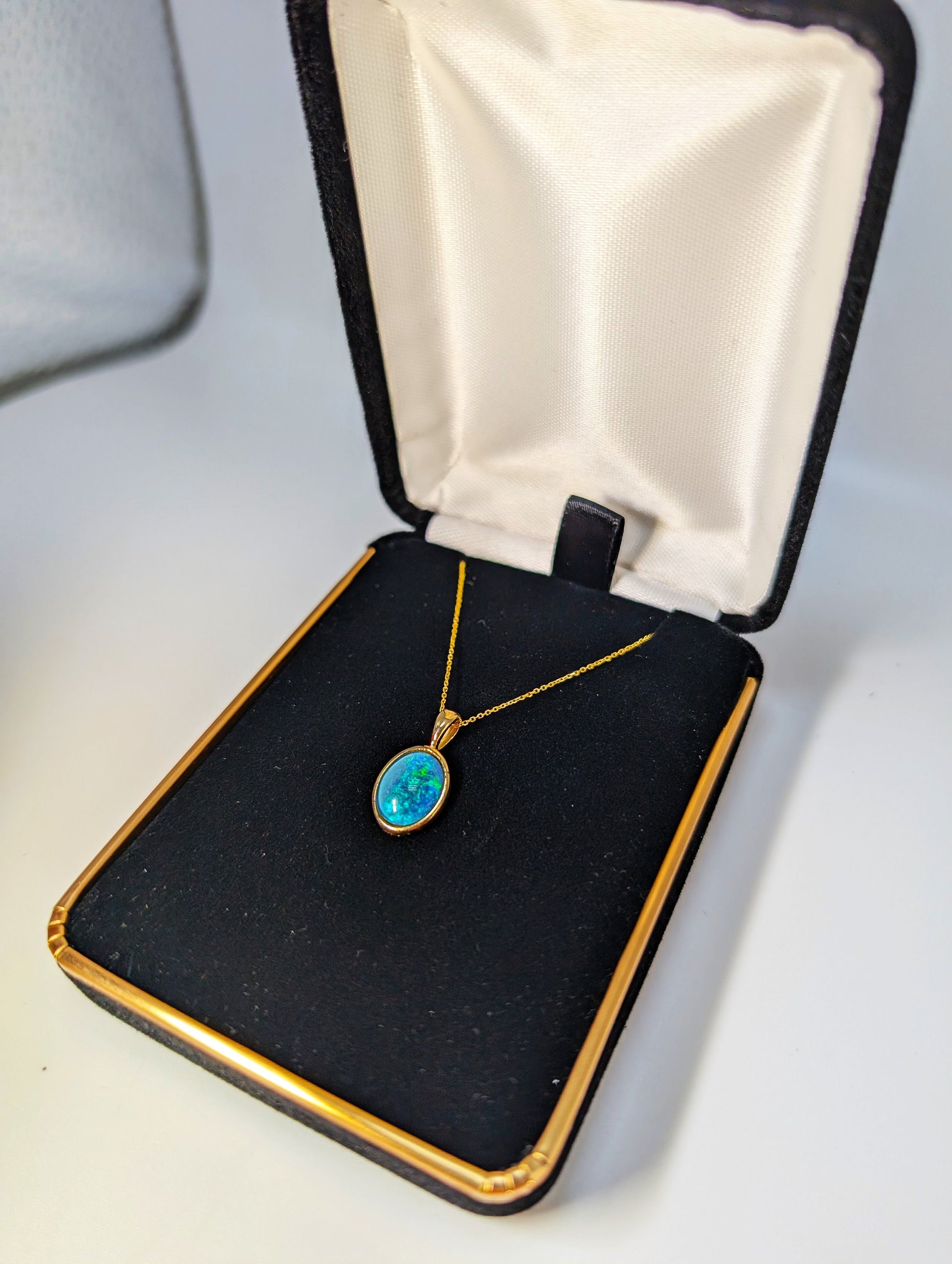 The 14k yellow gold pendant features a striking black opal sourced from Lightning Ridge, Australia, renowned for its exquisite opals. The pendant showcases the opal's vivid play-of-color, with flashes of blue, green, and hints of red dancing across its dark background. The rich yellow gold setting enhances the opal's brilliance, creating a luxurious and timeless piece of jewelry that captures the unique beauty of one of nature's most mesmerizing gemstones.