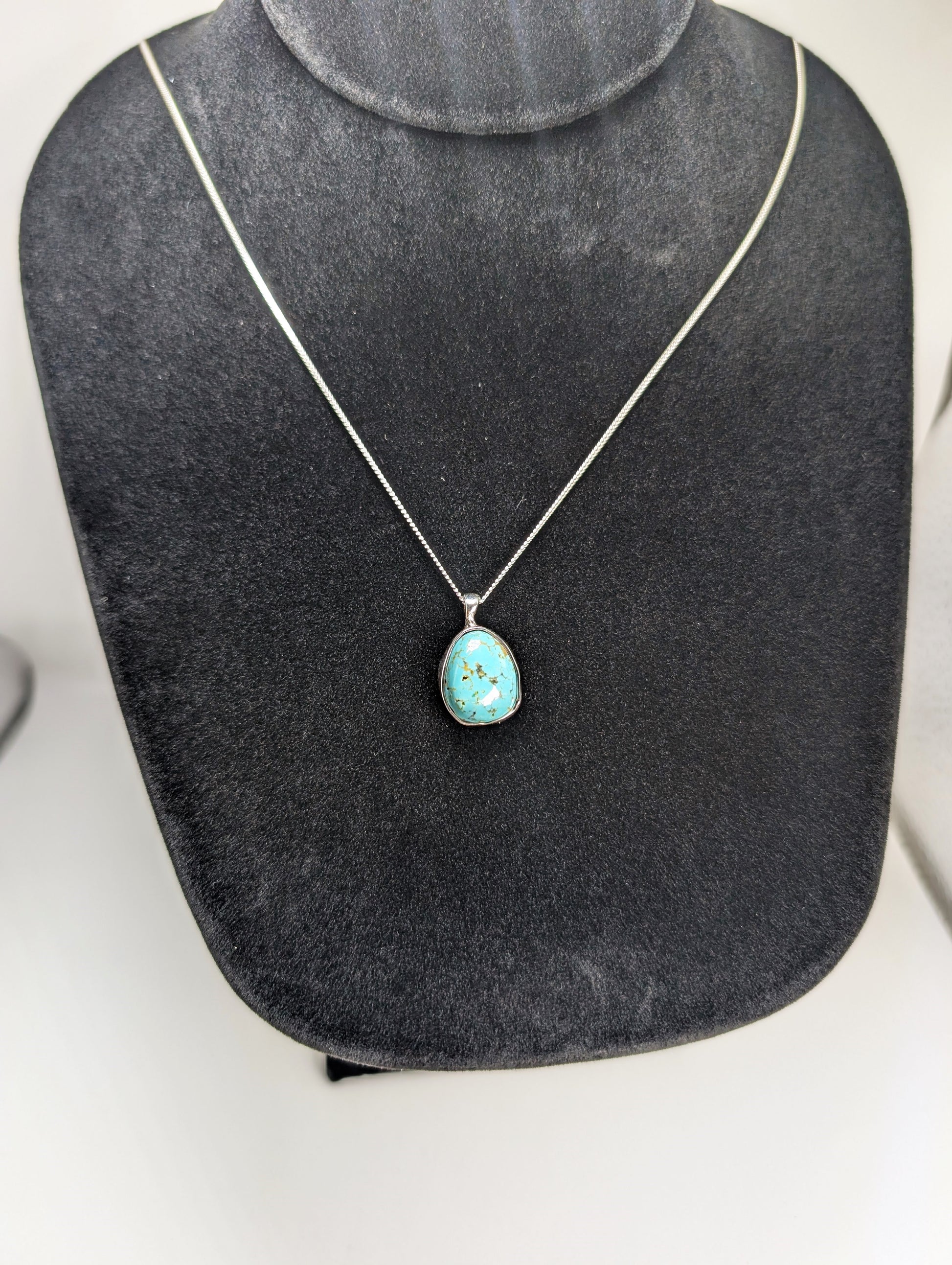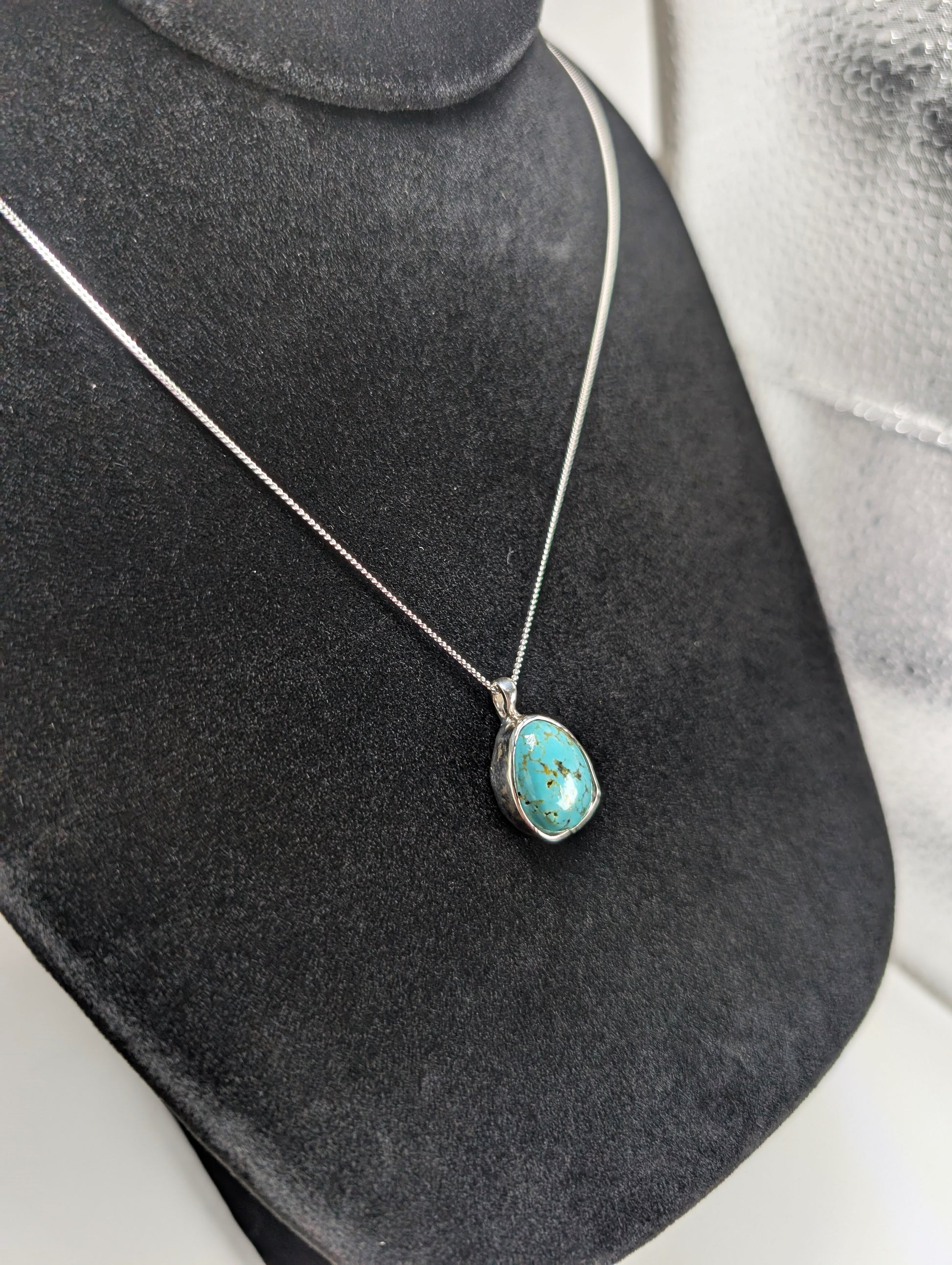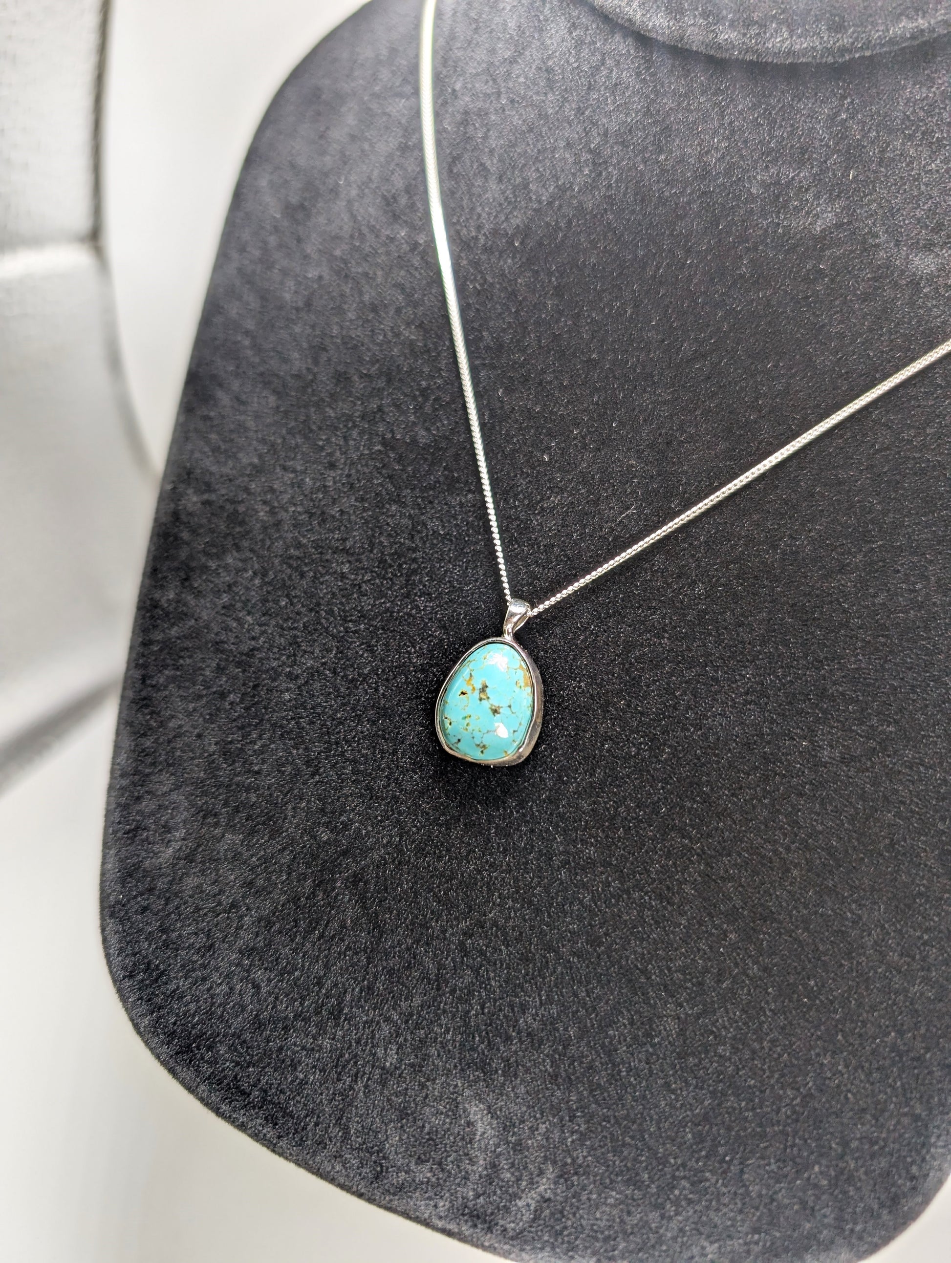 Genuine turquoise from the legendary Number 9 Mine in Nevada, set in .925 sterling silver and suspended from a matching .925 sterling silver chain.