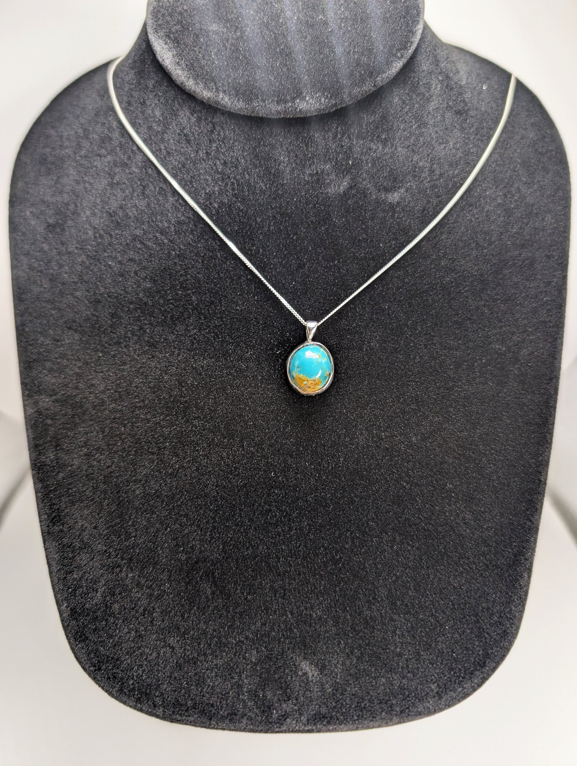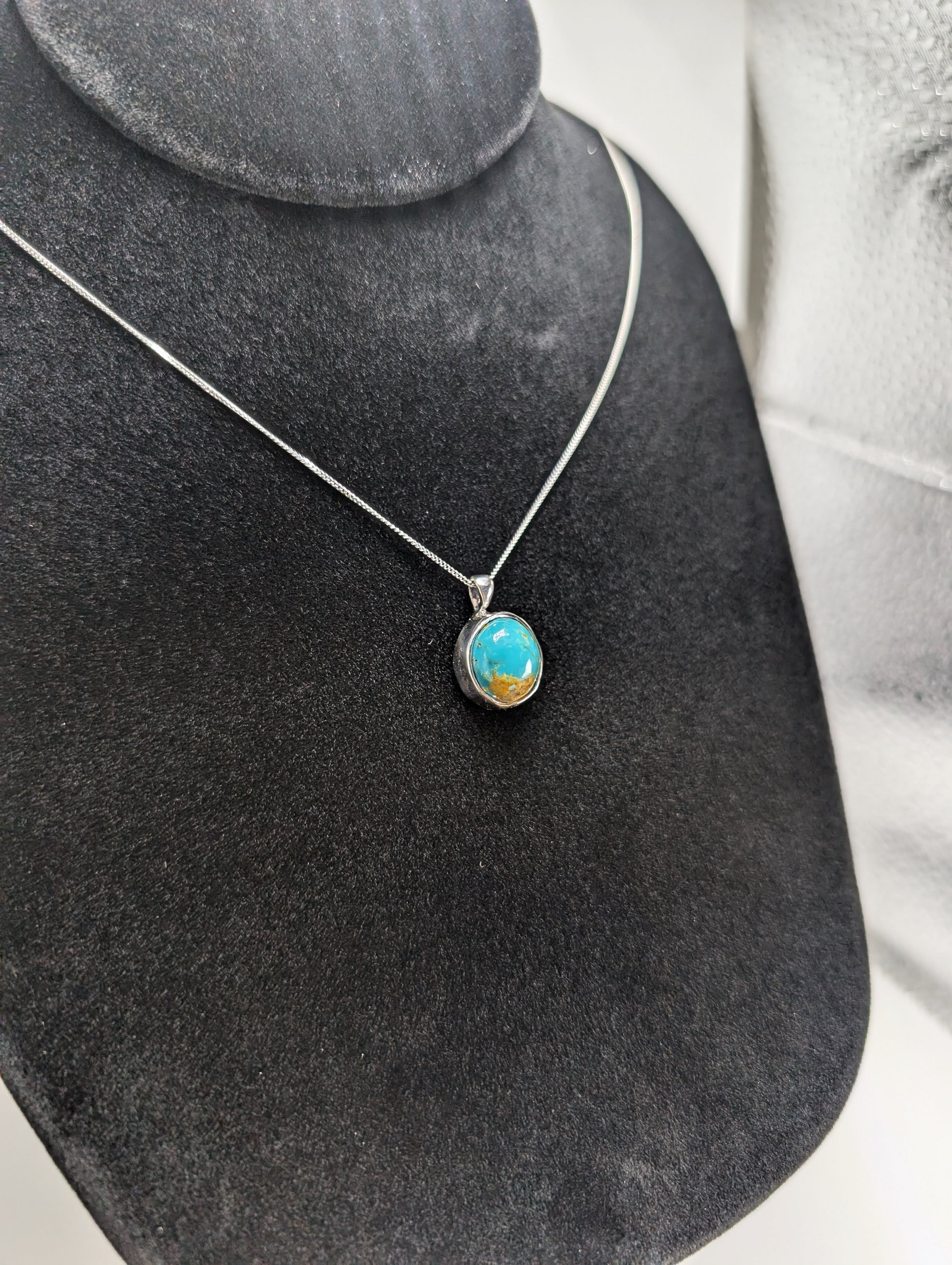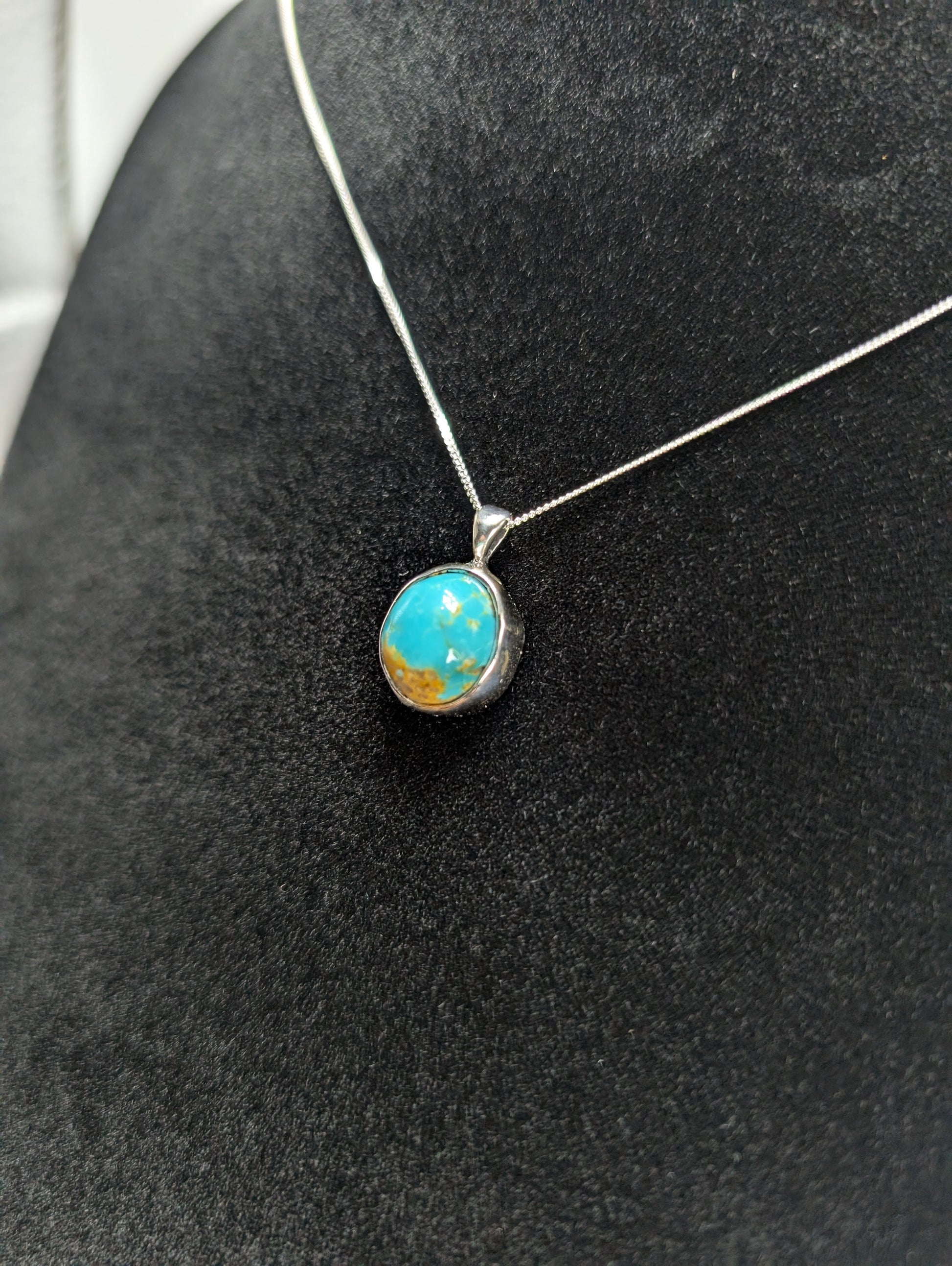 Genuine turquoise from the legendary Number 9 Mine in Nevada, set in .925 sterling silver and suspended from a matching .925 sterling silver chain.
