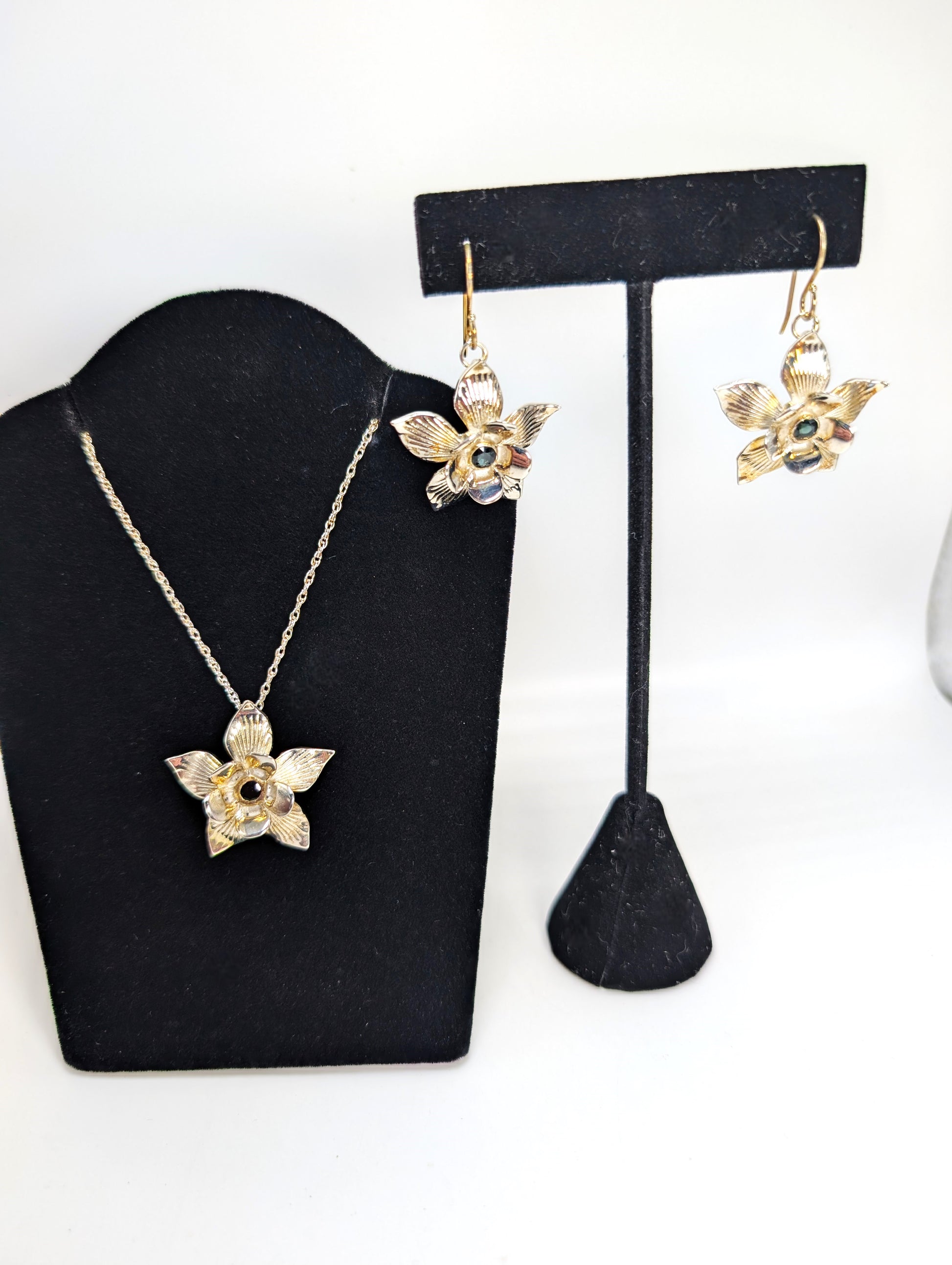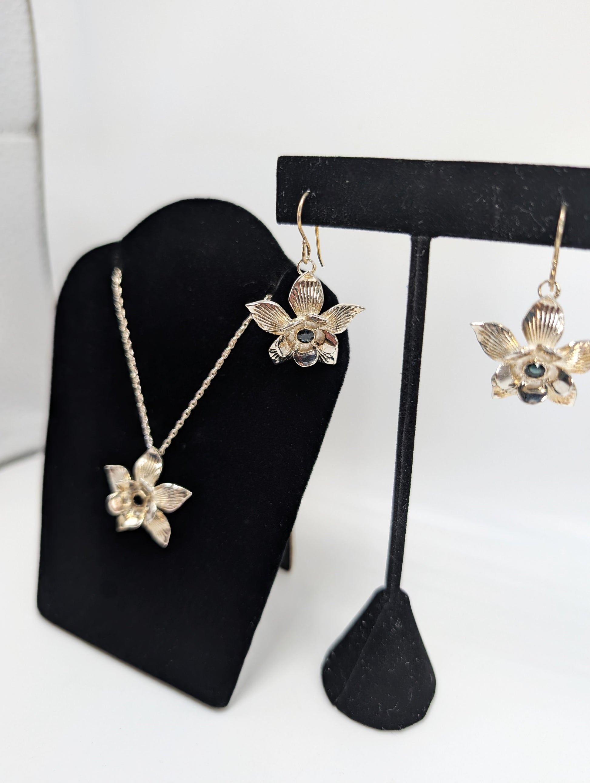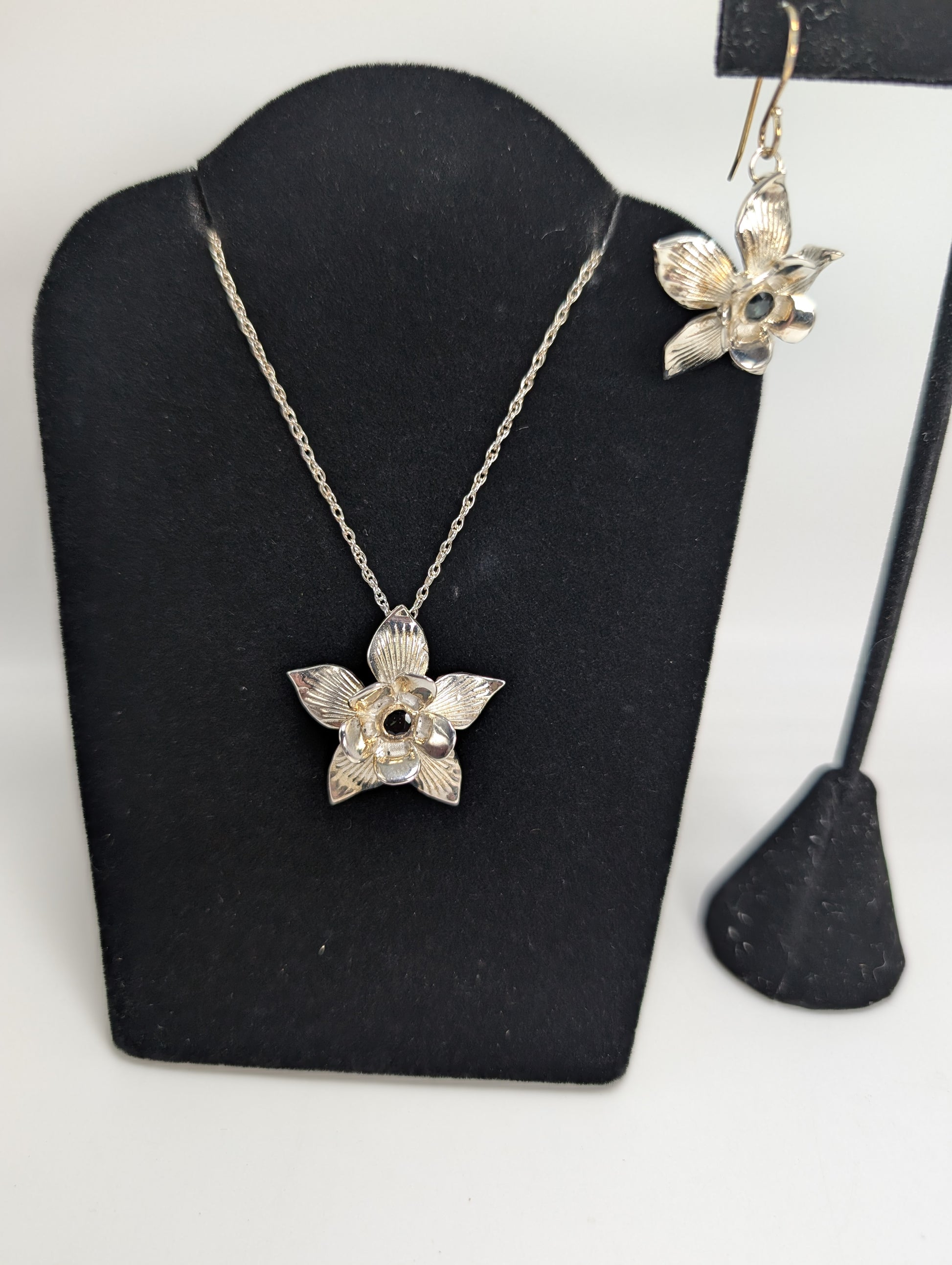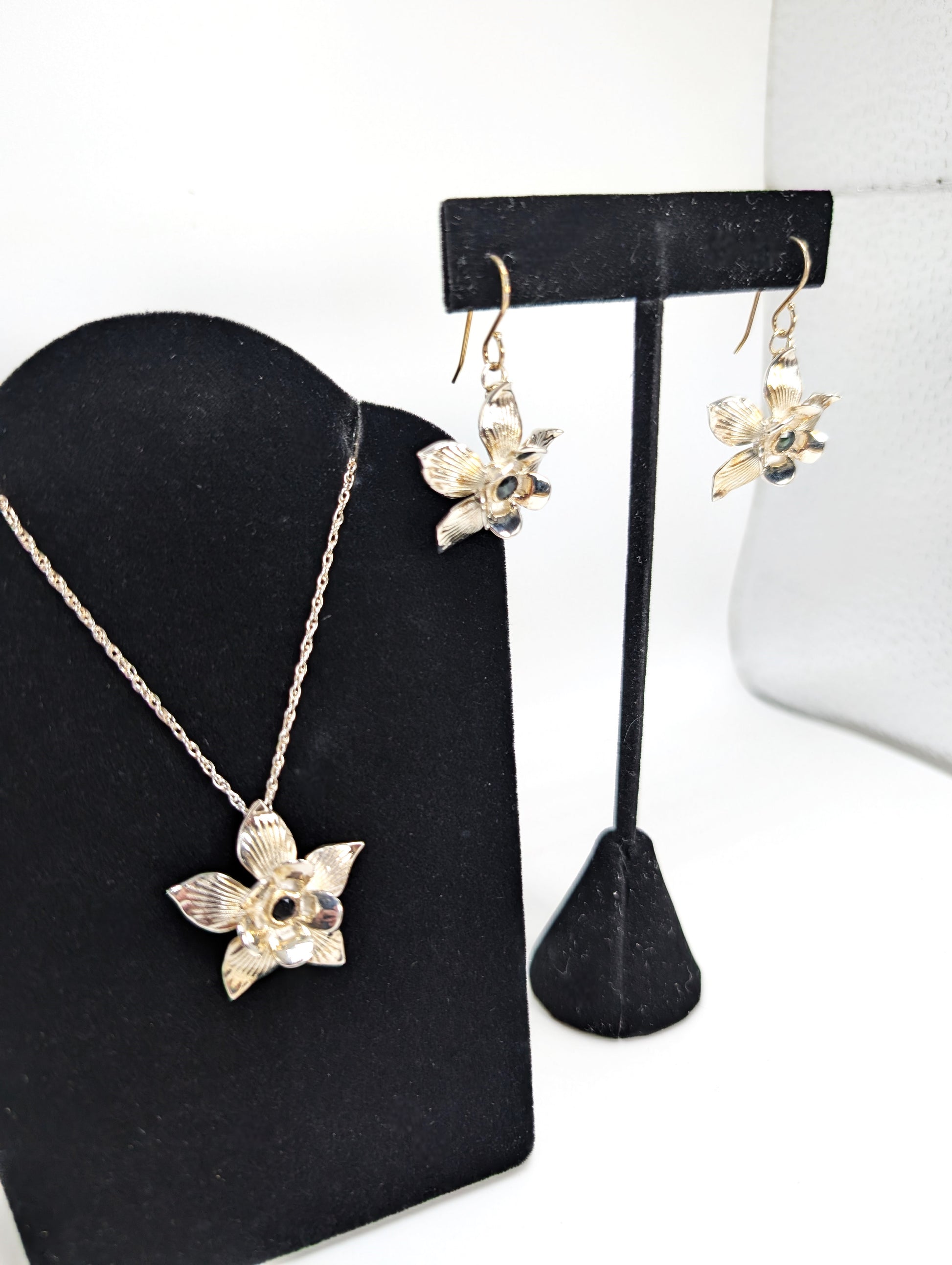 .925 Silver Colorado Columbine Flower Earrings and Pendant with Sapphires