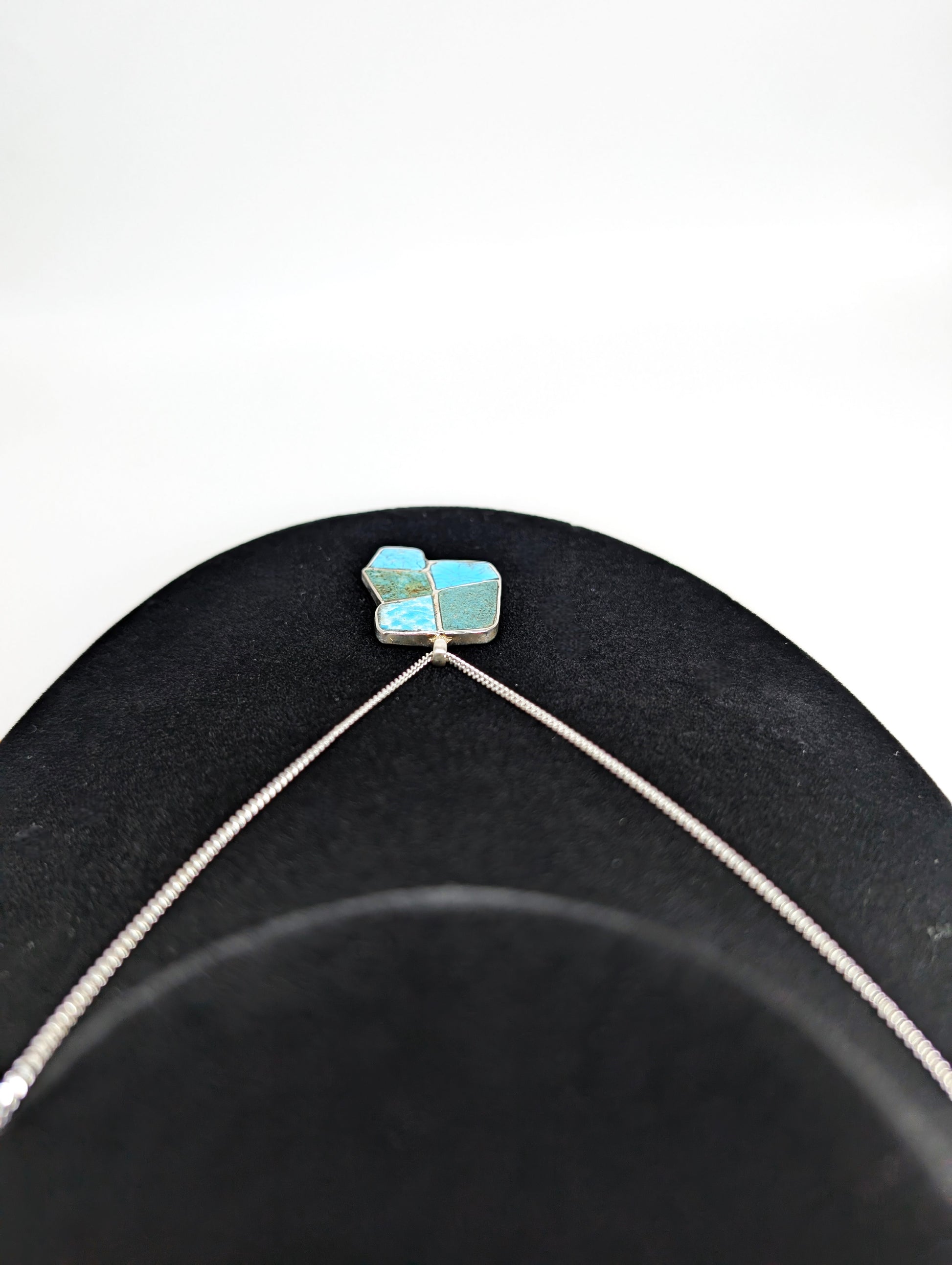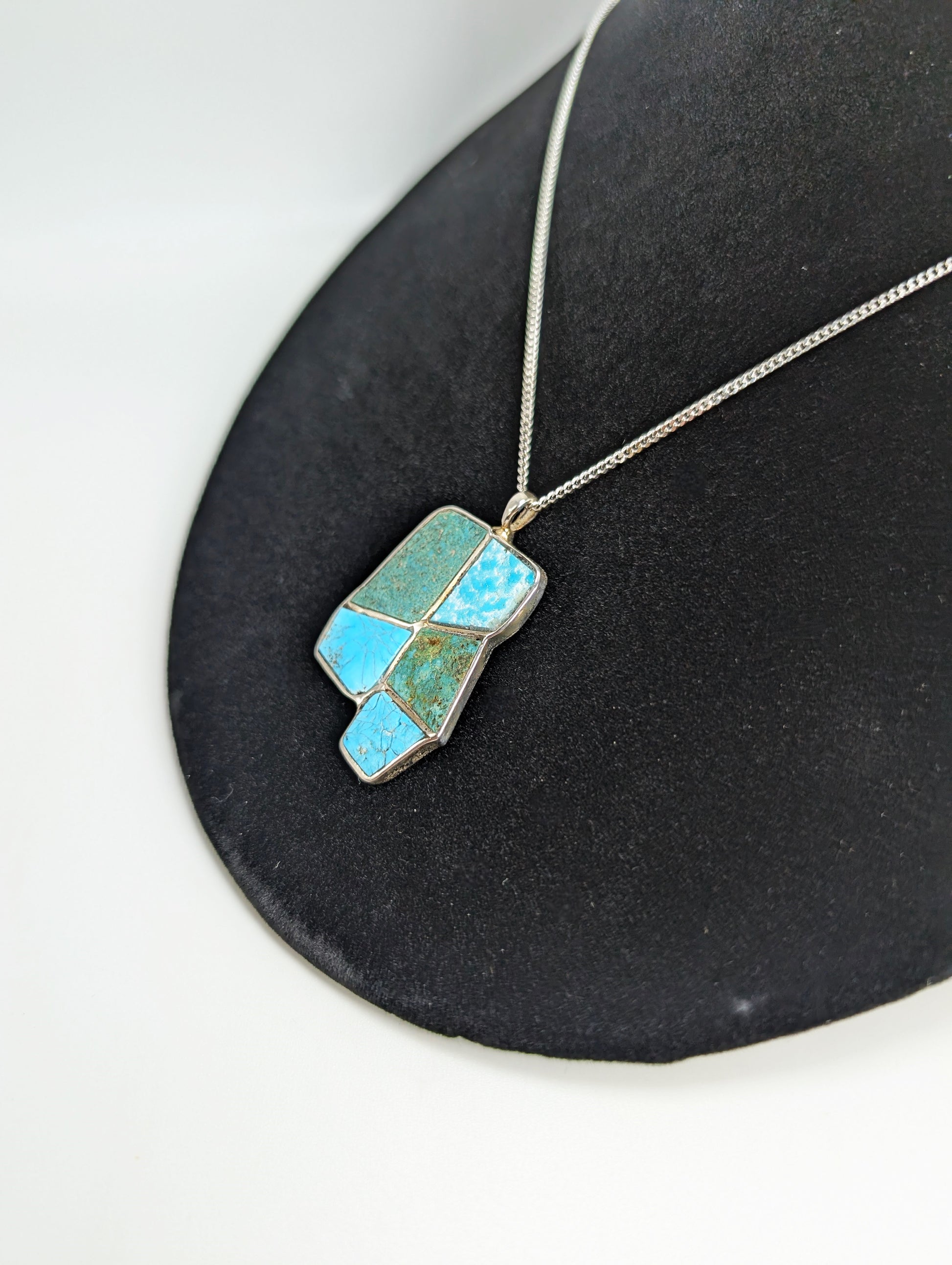 A .925 silver pendant inlaid with vibrant turquoise from both Villa Grove, Colorado and King Manassa, Colorado. This striking piece beautifully showcases the true essence and natural beauty of Colorado.