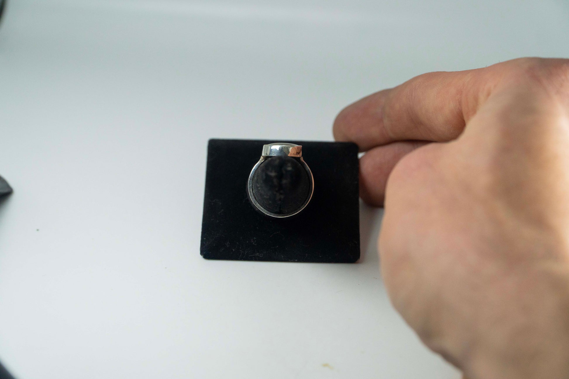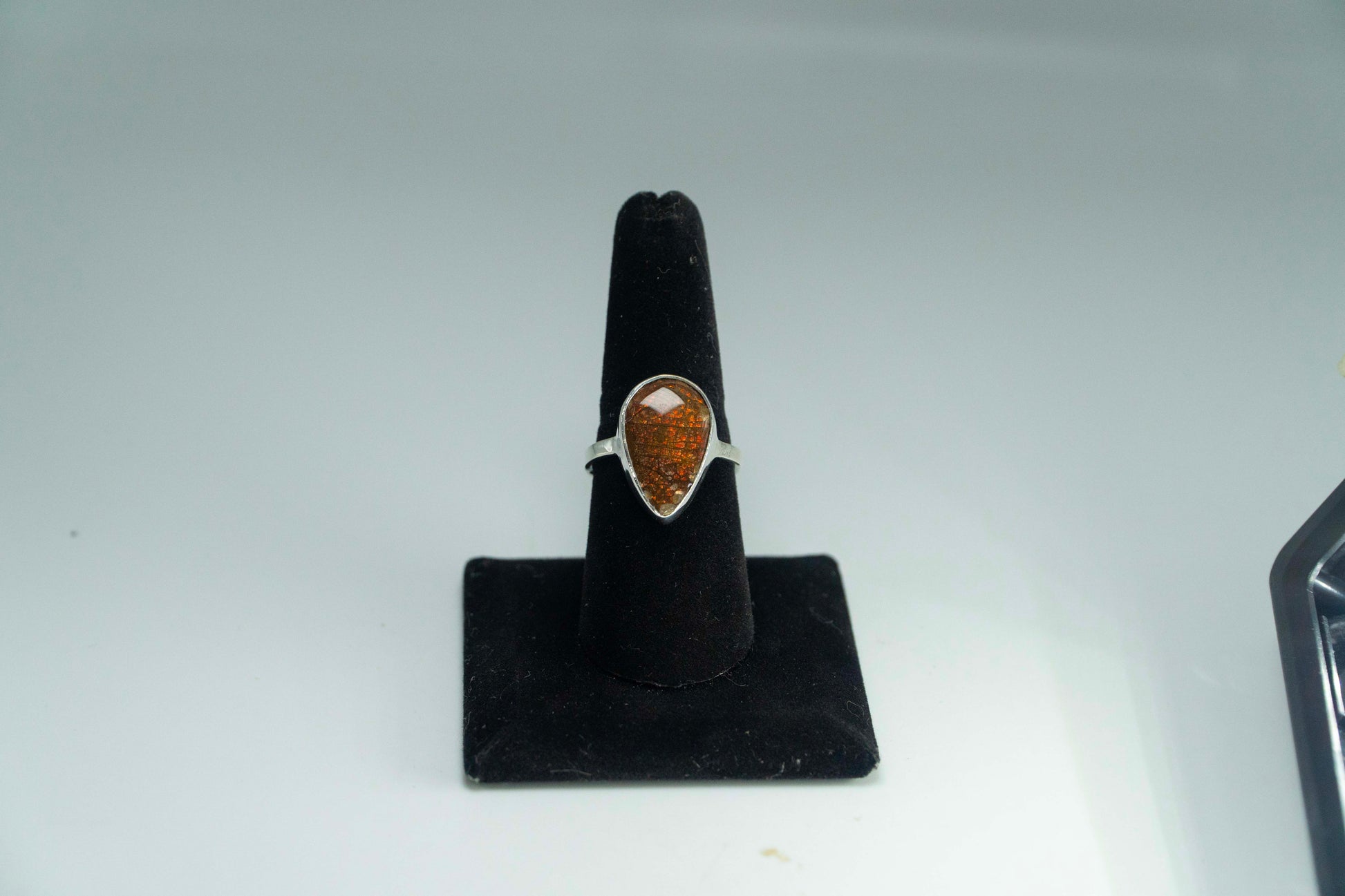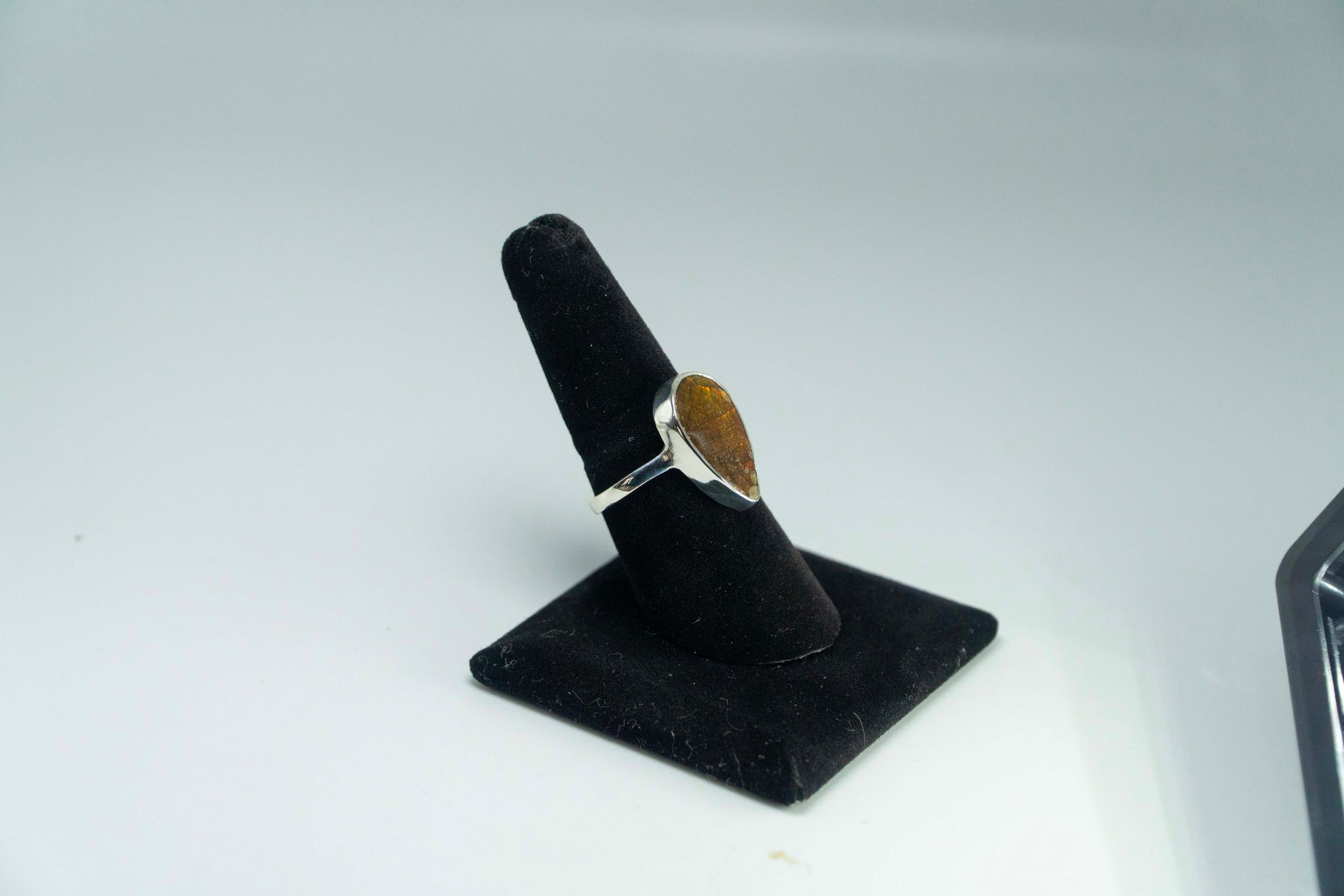 This silver ring features a stunning natural piece of Ammolite, a rare and opalized gemstone found exclusively in Alberta, Canada. Each stone is unique, with a six-digit number on the back that traces its origin directly to the mine. Formed from fossilized seashells, Ammolite is a truly one-of-a-kind treasure with vibrant, iridescent beauty.