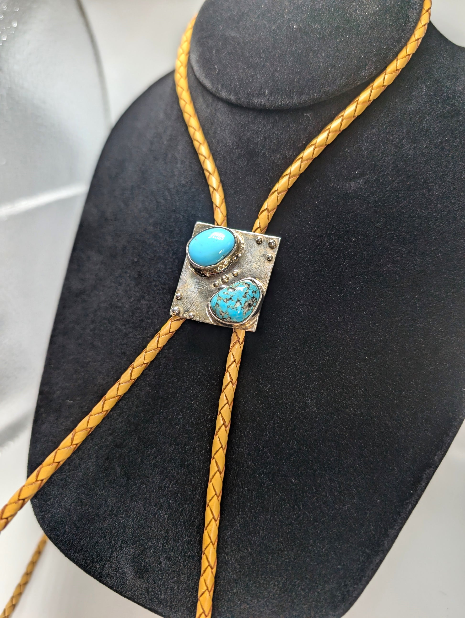 This custom-made bolo tie features striking Leadville, Colorado turquoise and Sleeping Beauty turquoise, set in .925 sterling silver and paired with hand-braided natural leather. A bold and timeless accessory, this piece is a true testament to craftsmanship and Southwestern elegance.