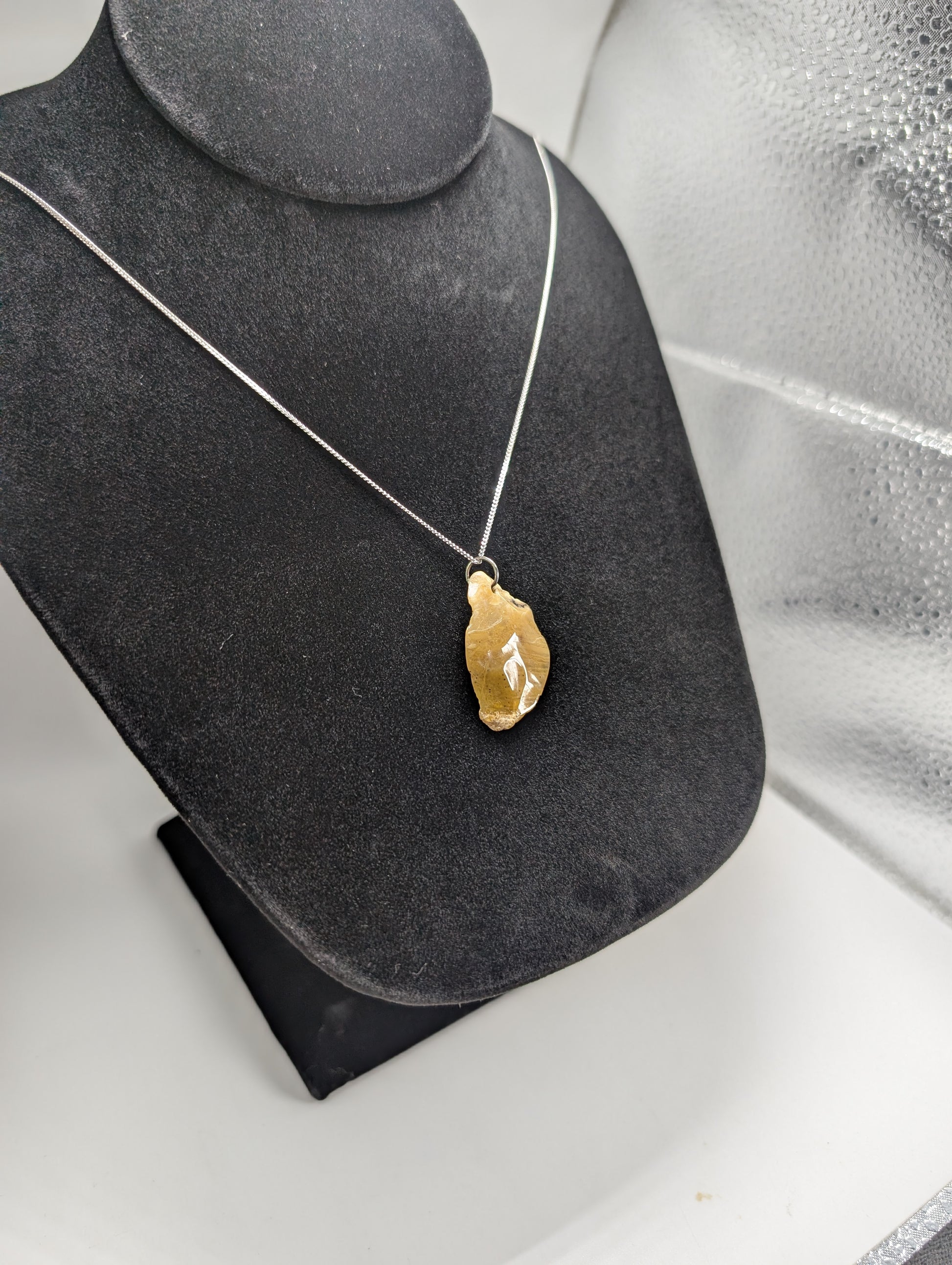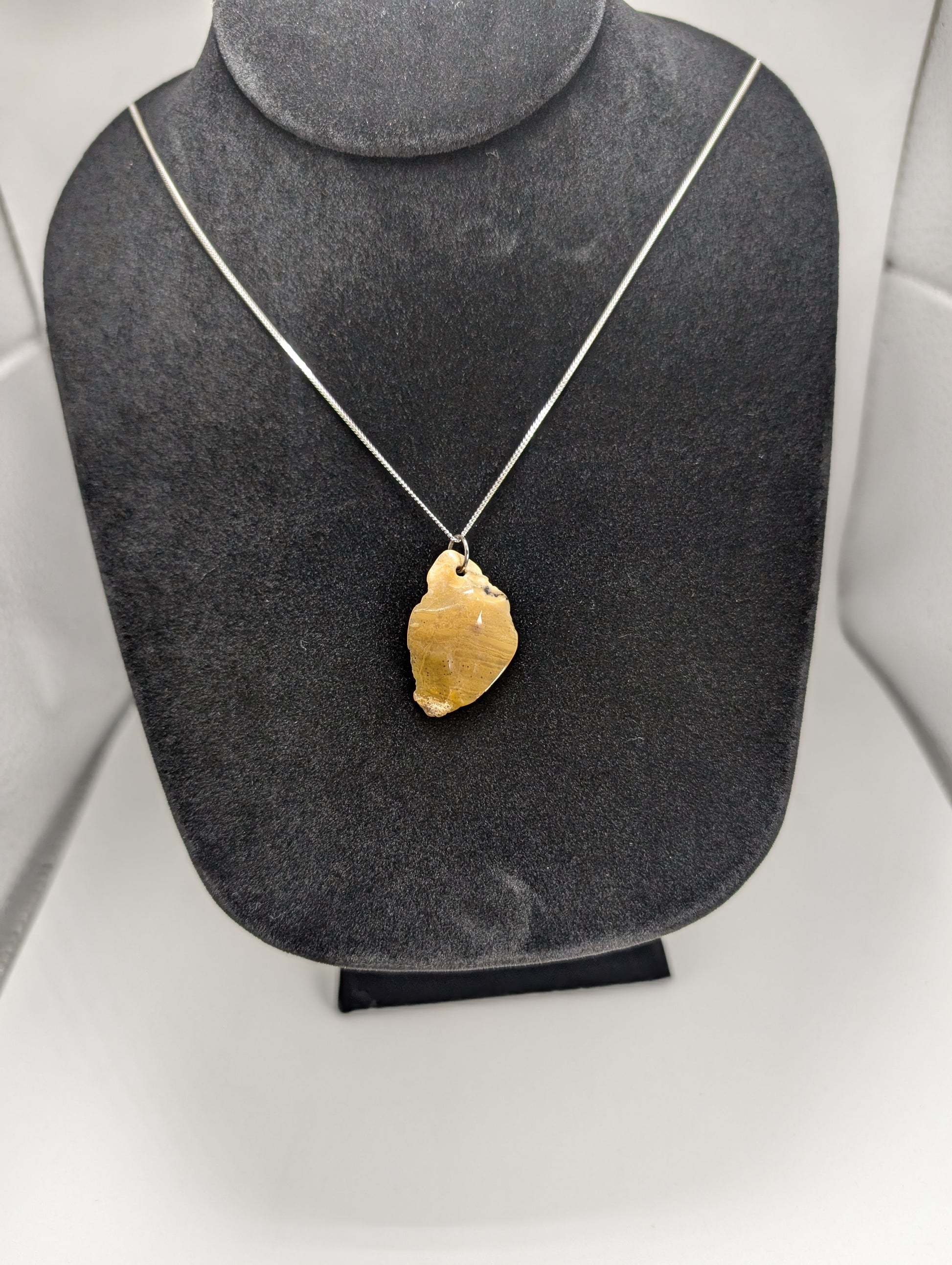 This polished jasper stone is a remarkable byproduct of ancient Native American spear-making, carrying with it centuries of history and craftsmanship. Expertly tumbled to achieve its natural shine, the stone is paired with a .925 sterling silver chain, creating a piece that’s both meaningful and timeless.