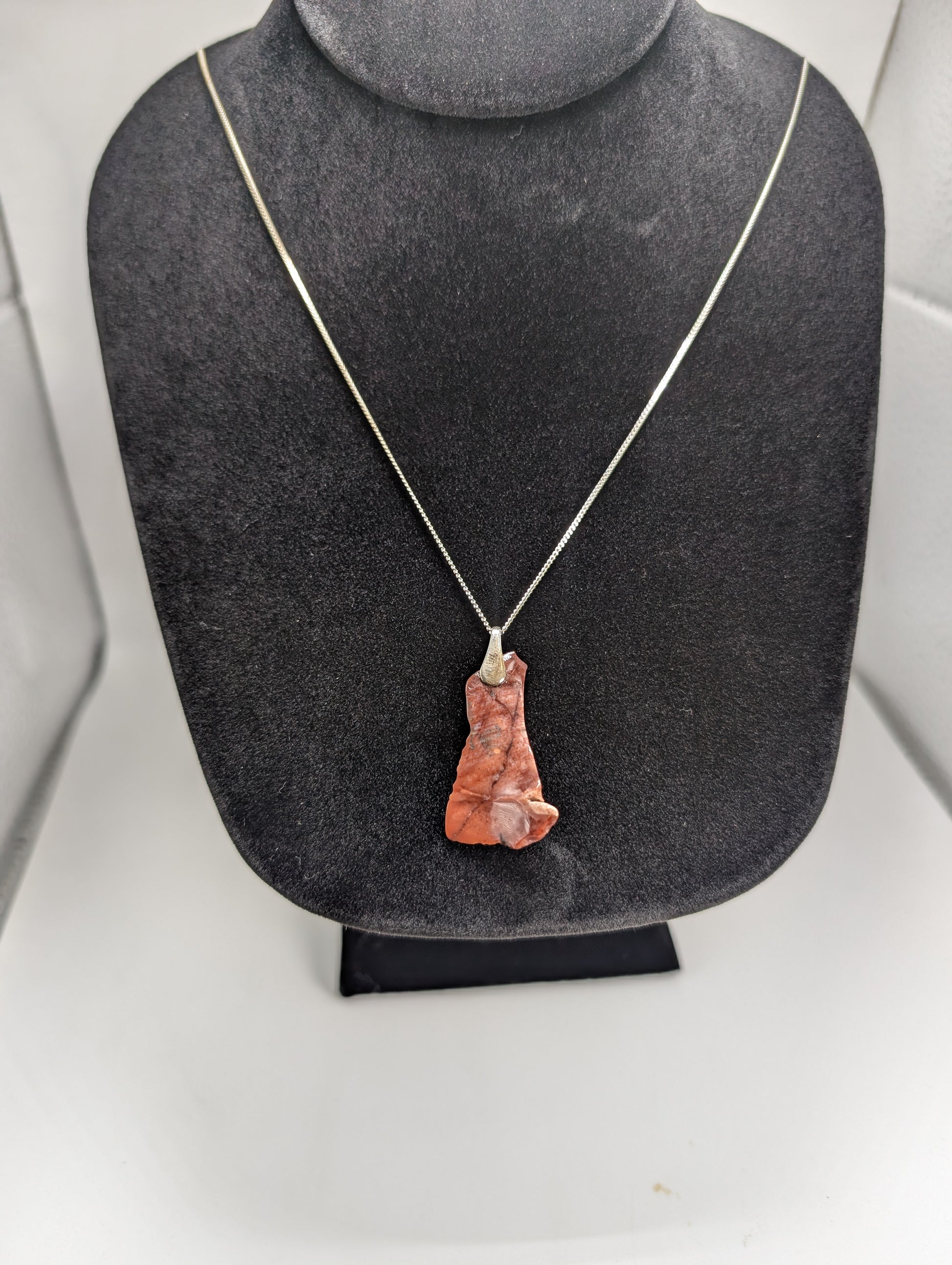 This polished jasper stone is a remarkable byproduct of ancient Native American spear-making, carrying with it centuries of history and craftsmanship. Expertly tumbled to achieve its natural shine, the stone is paired with a .925 sterling silver chain, creating a piece that’s both meaningful and timeless.