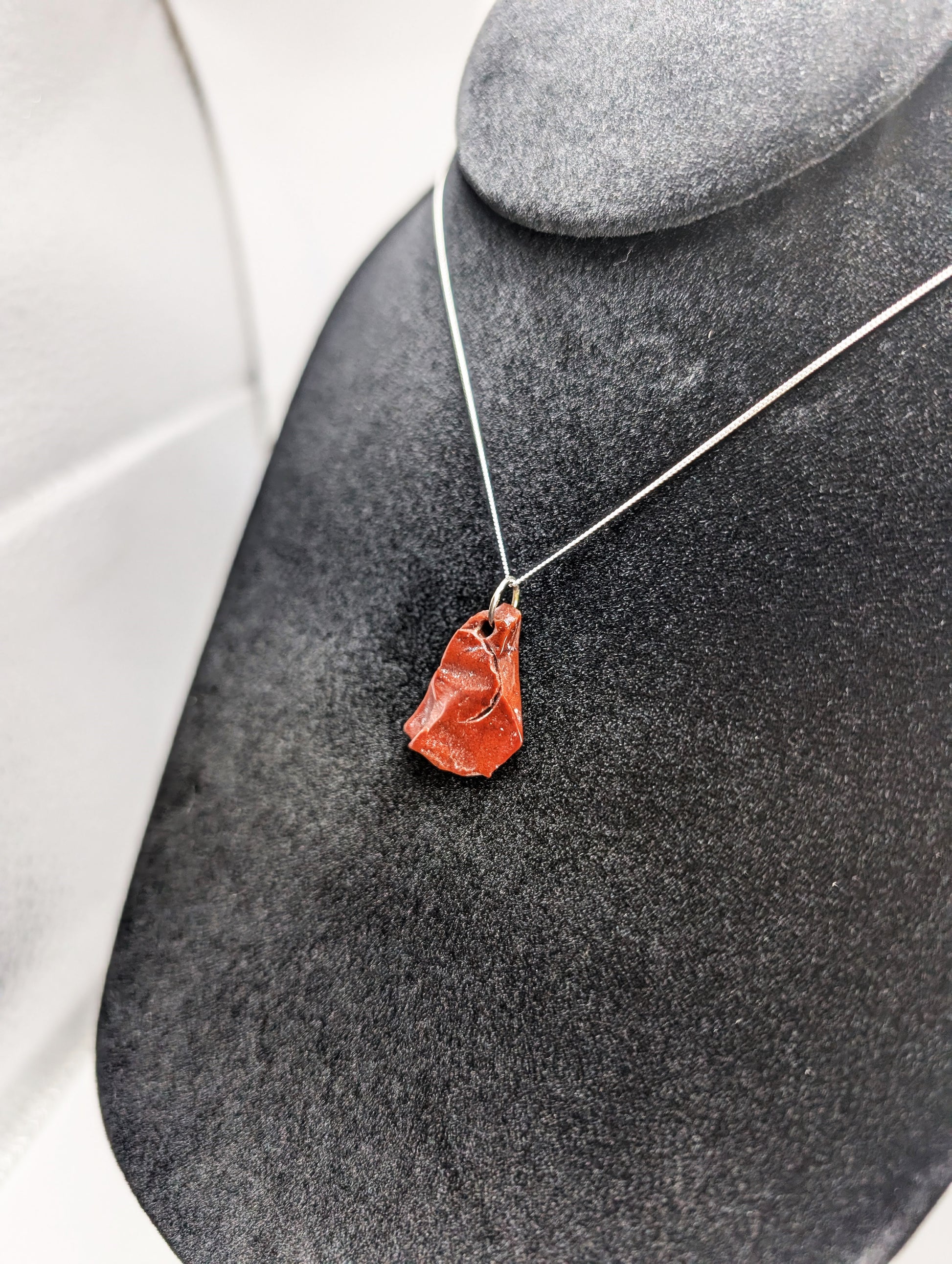 This polished jasper stone is a remarkable byproduct of ancient Native American spear-making, carrying with it centuries of history and craftsmanship. Expertly tumbled to achieve its natural shine, the stone is paired with a .925 sterling silver chain, creating a piece that’s both meaningful and timeless.
