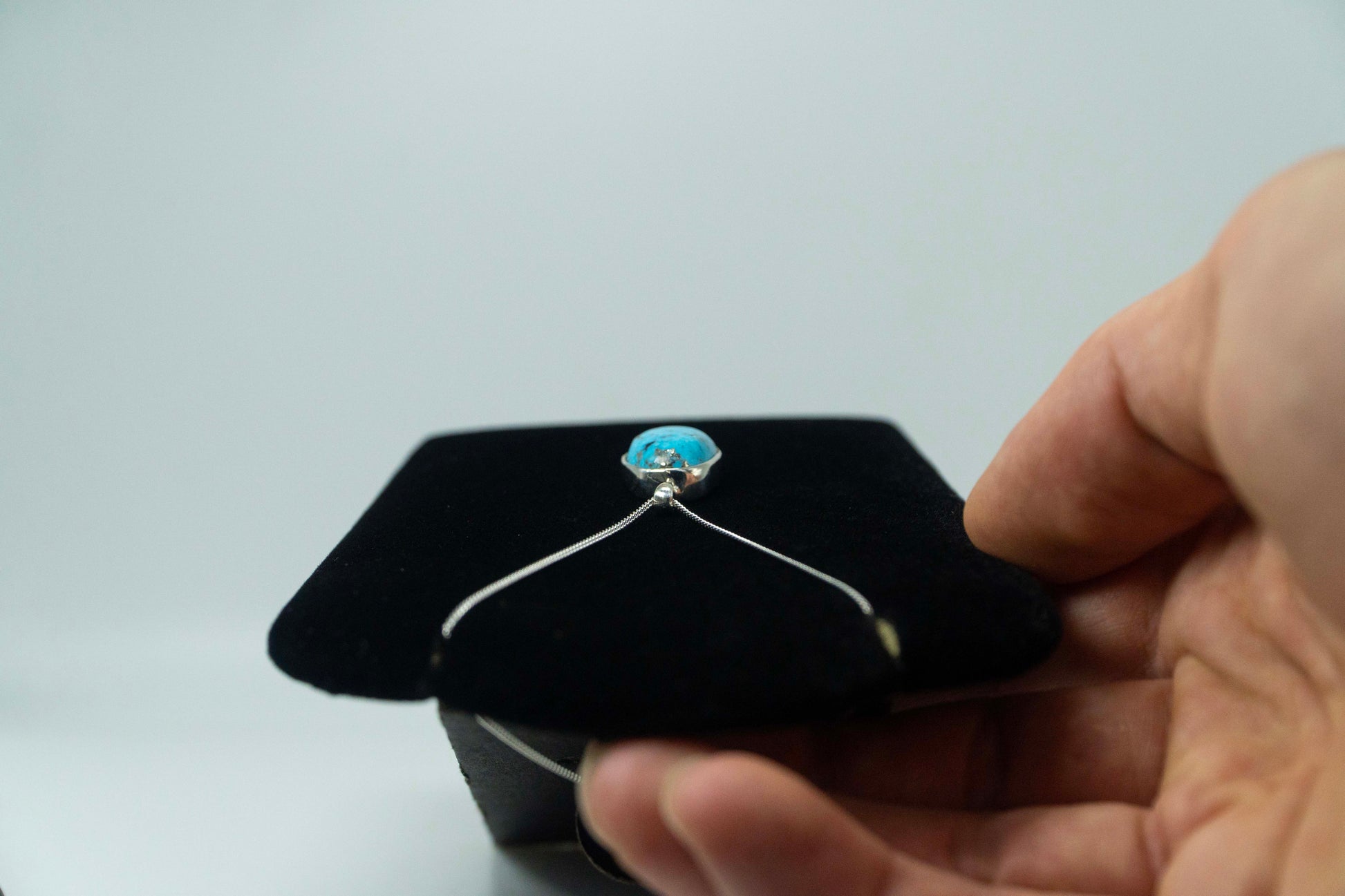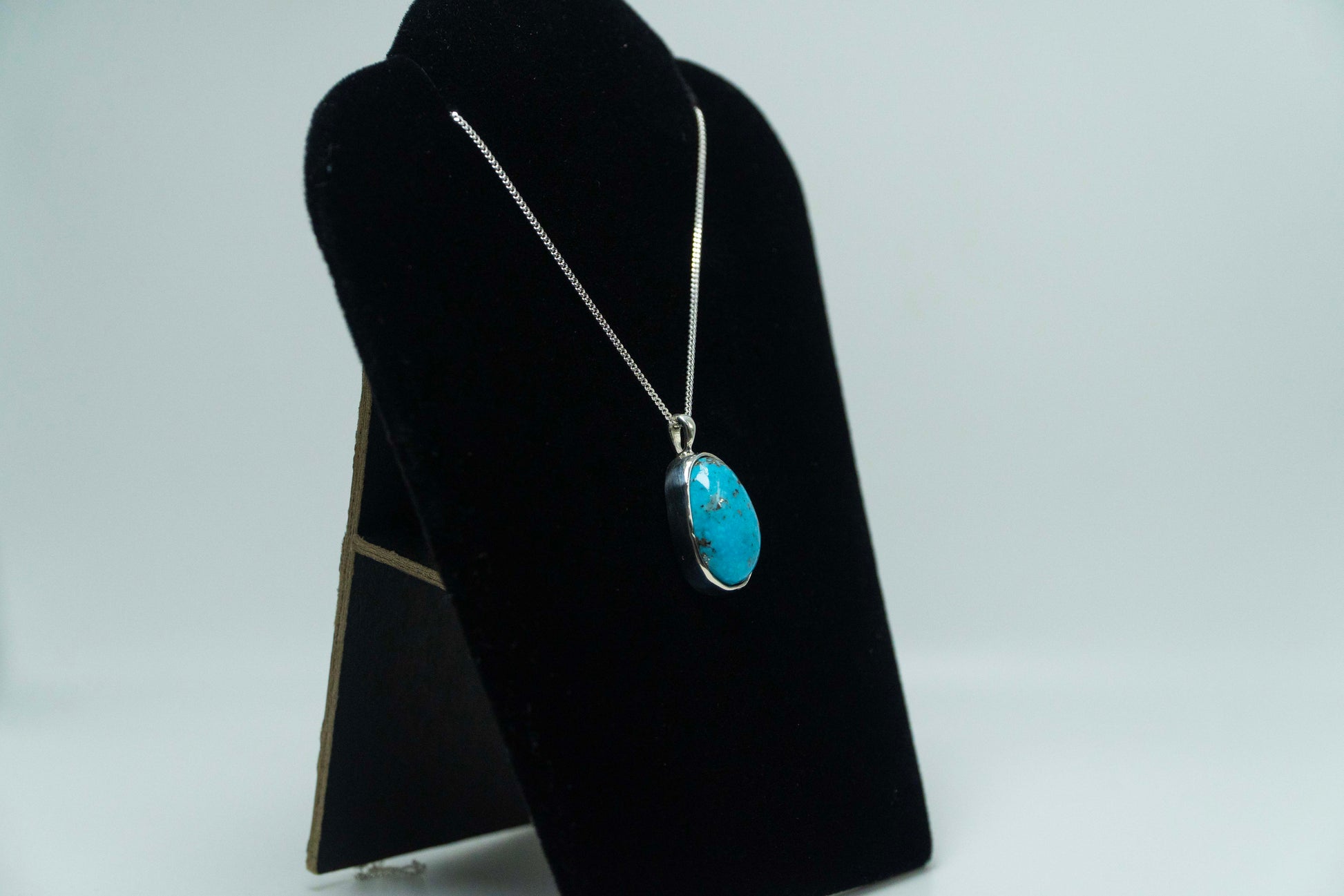 This elegant silver pendant is set with turquoise from the renowned mines of Sonora, Mexico. The turquoise, known as 'Campitos,' is prized for its vibrant color and exceptional quality. Expertly handcrafted by Borek Jewelers in Leadville, Colorado, this piece is a true one-of-a-kind creation, blending artistry with the natural beauty of the stone.