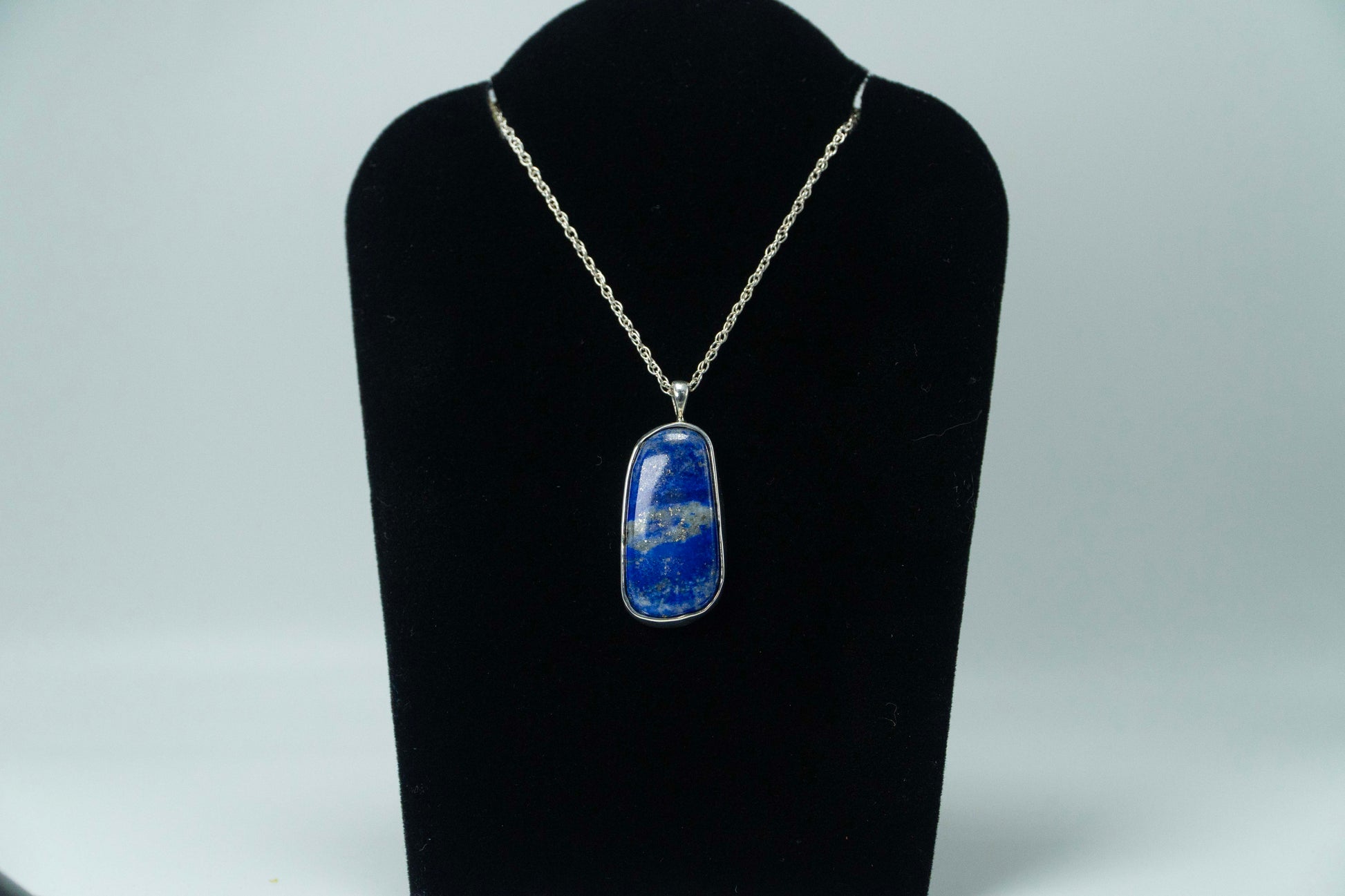 This beautiful custom .925 silver pendant features a unique piece of Lapis Lazuli, distinguished by delicate flecks of pyrite throughout the stone. Handcrafted by Borek Jewelers in Leadville, Colorado, this pendant is a stunning accessory for anyone to wear.