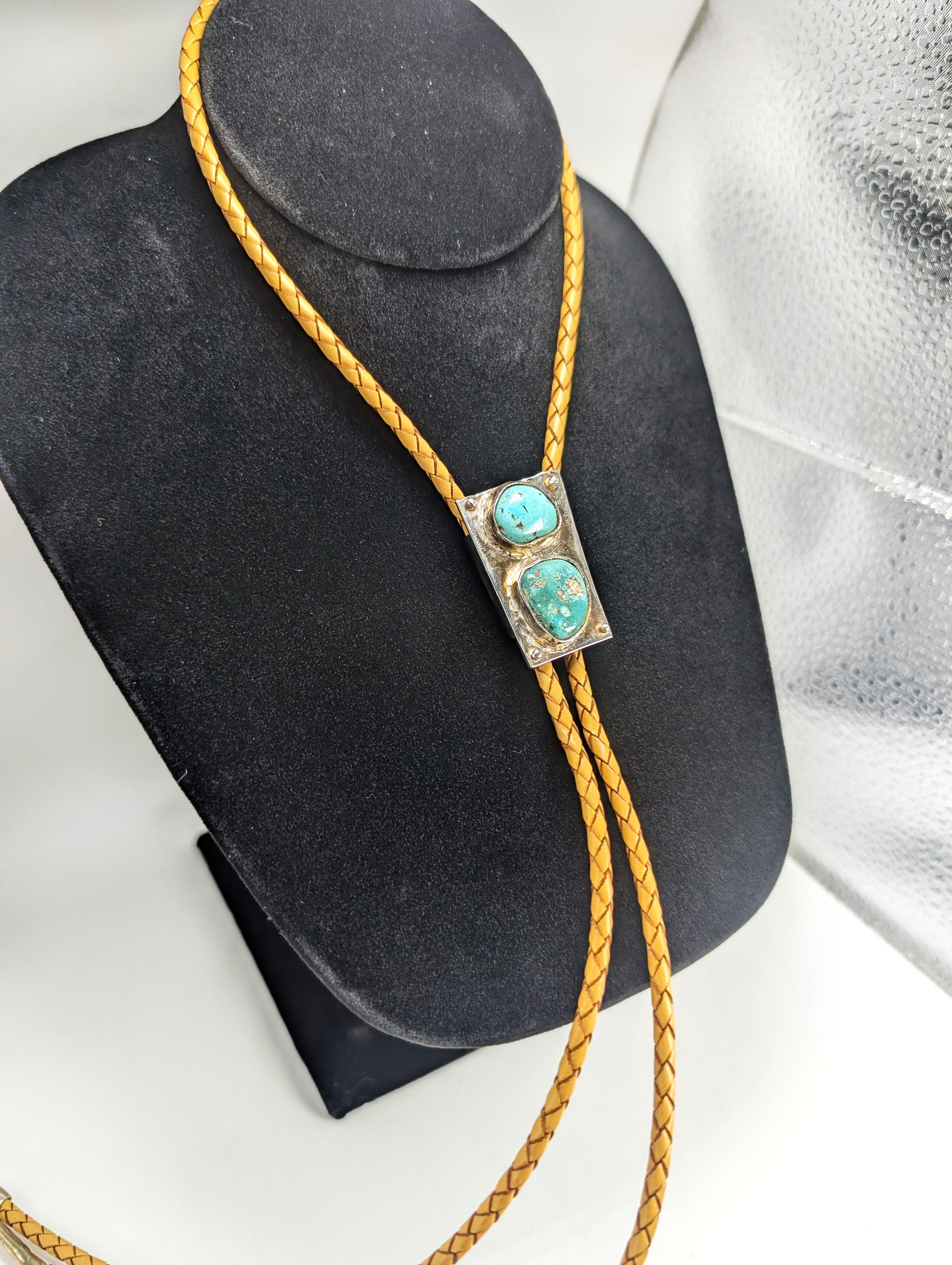 This custom-made bolo tie features striking Cripple Creek/ Leadville, Colorado turquoise, set in .925 sterling silver and paired with hand-braided natural leather. A bold and timeless accessory, this piece is a true testament to craftsmanship and Southwestern elegance.