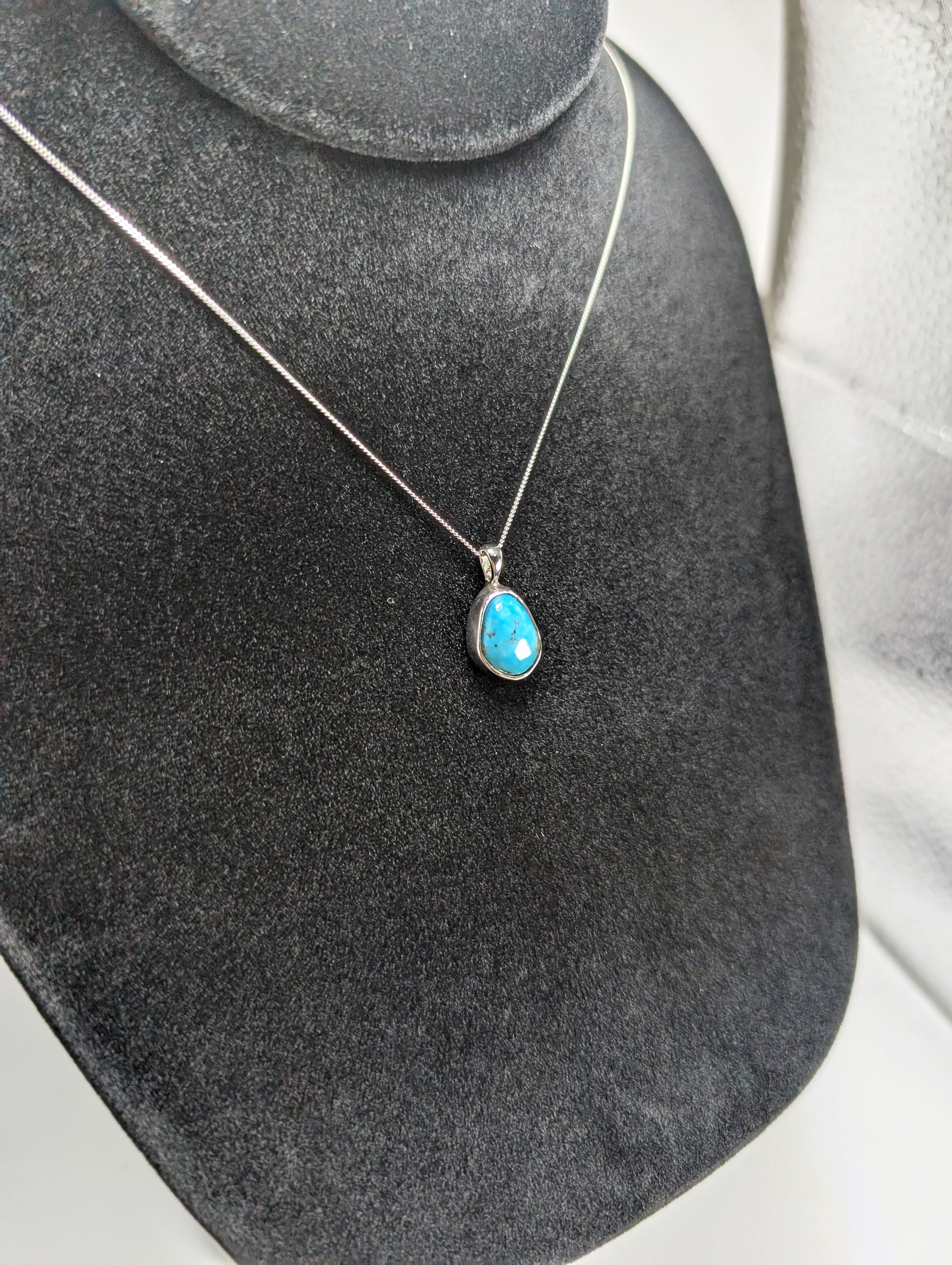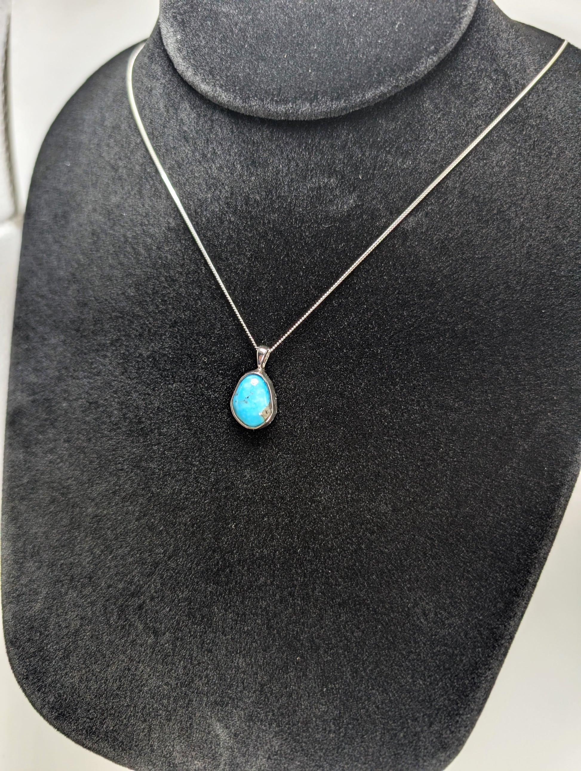 Authentic turquoise from the renowned Nacozari Mine in Sonora, Mexico, beautifully set in .925 sterling silver and paired with a matching .925 sterling silver chain.