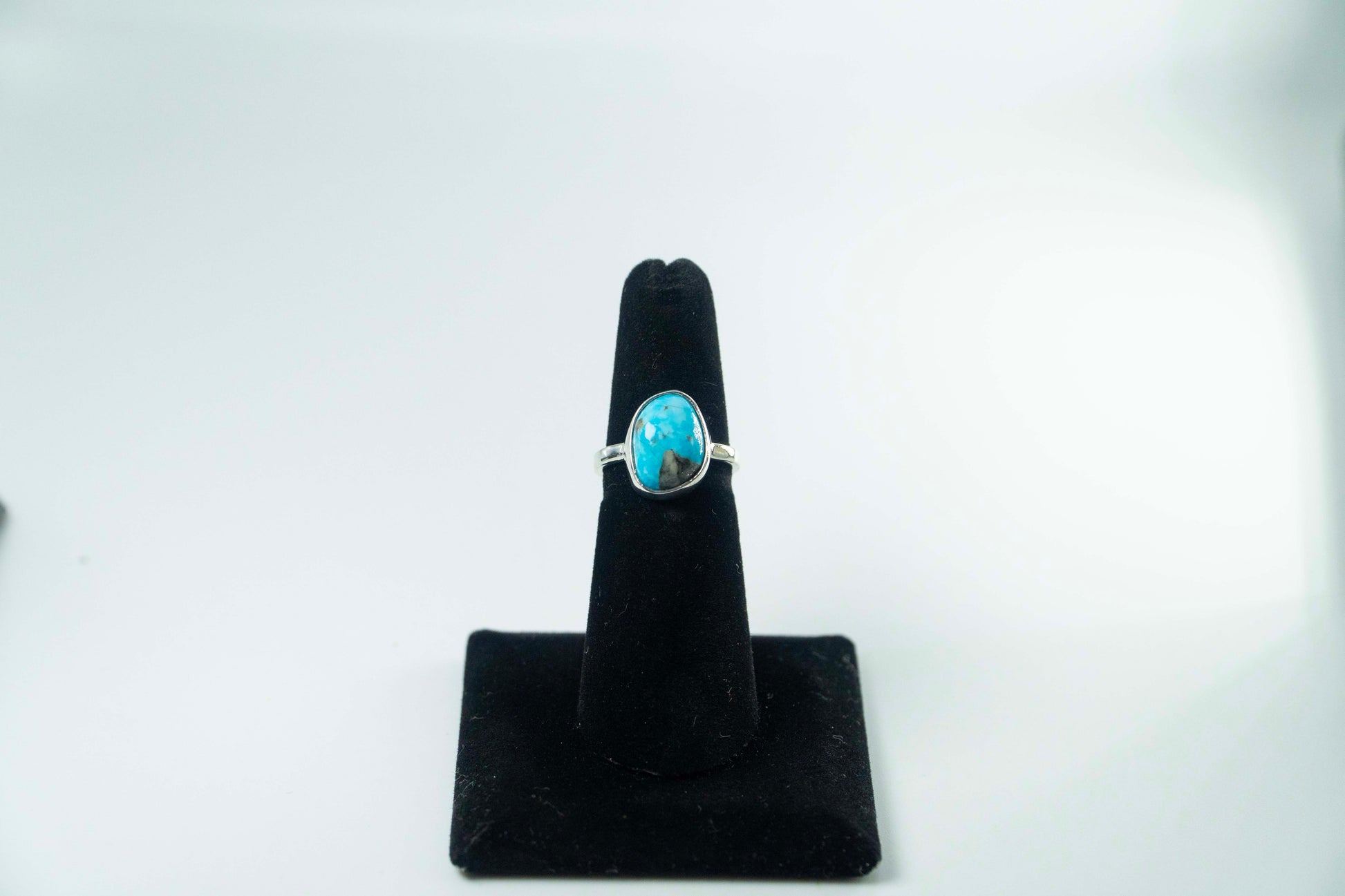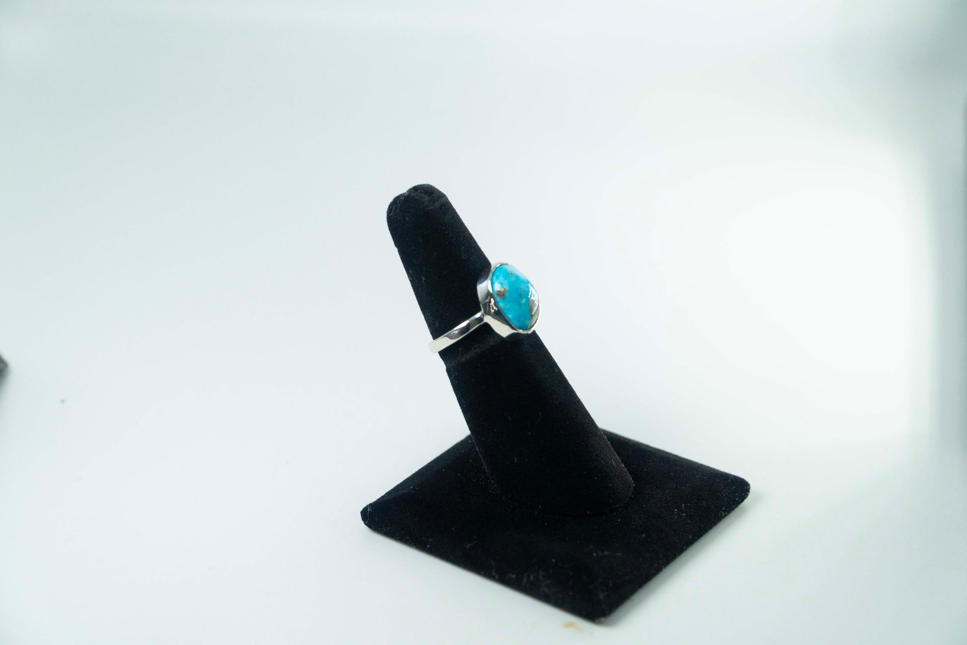 Presenting our exquisite Nacozari Turquoise ring, meticulously set in custom .925 sterling silver. This stunning piece of jewelry is perfect for anniversaries, birthdays, or wedding gifts. The turquoise, sourced from a rich copper mine in Sonora, Mexico, boasts a captivating blue hue that is truly one-of-a-kind. Handcrafted with precision at our Leadville, Colorado studio, this ring exemplifies artisanal craftsmanship. Add a touch of elegance and timeless beauty to your jewelry collection with this exceptional Nacozari Turquoise ring.