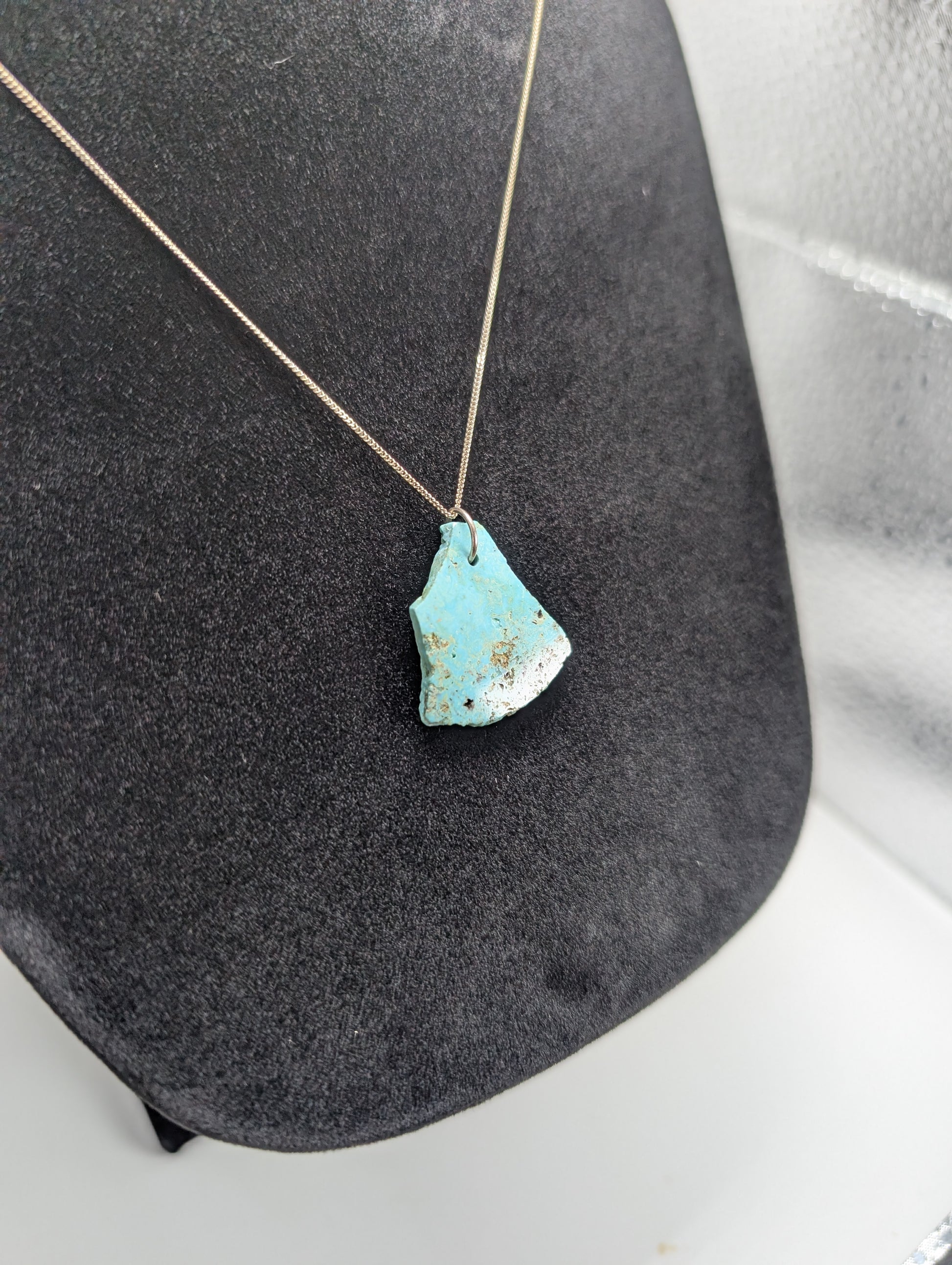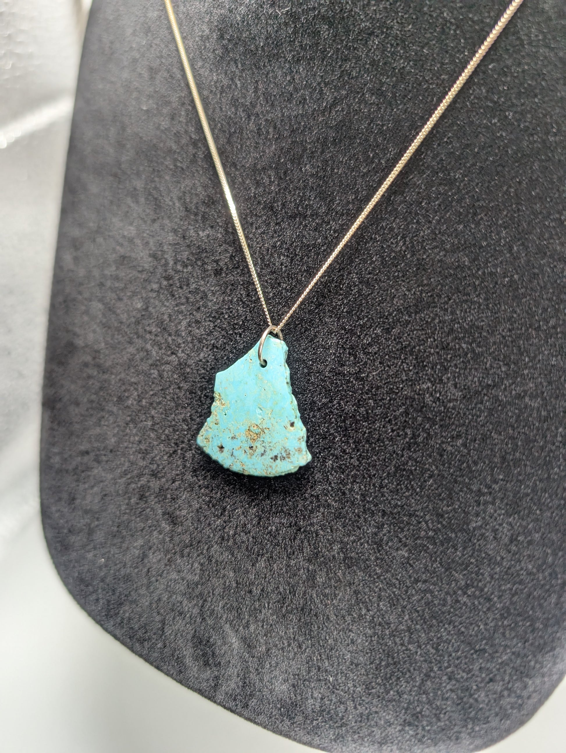 This piece features genuine turquoise from the historic King Manassa Mine near Manassa, Colorado. One side is polished to enhance its vibrant beauty, while the other remains unpolished, showcasing the stone's raw, natural character. It is elegantly set with a .925 sterling silver jump ring and chain, blending authenticity with timeless craftsmanship.