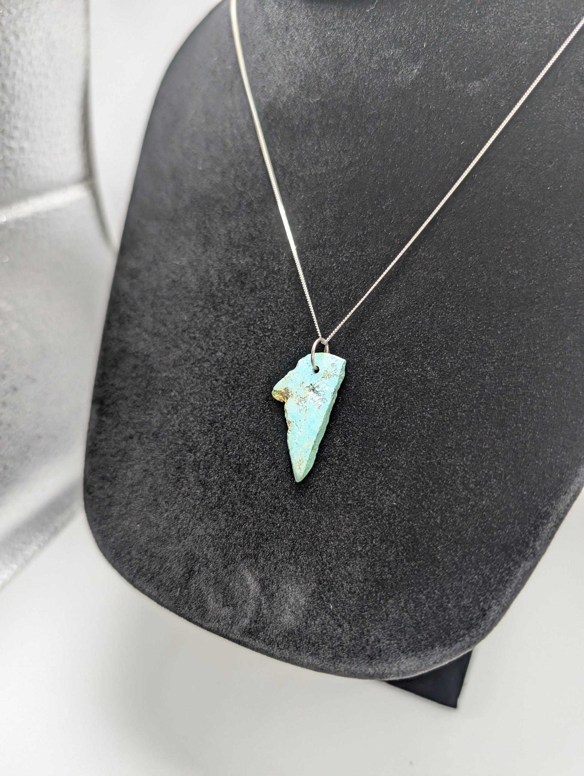 This piece features genuine turquoise from the historic King Manassa Mine near Manassa, Colorado. One side is polished to enhance its vibrant beauty, while the other remains unpolished, showcasing the stone's raw, natural character. It is elegantly set with a .925 sterling silver jump ring and chain, blending authenticity with timeless craftsmanship.
