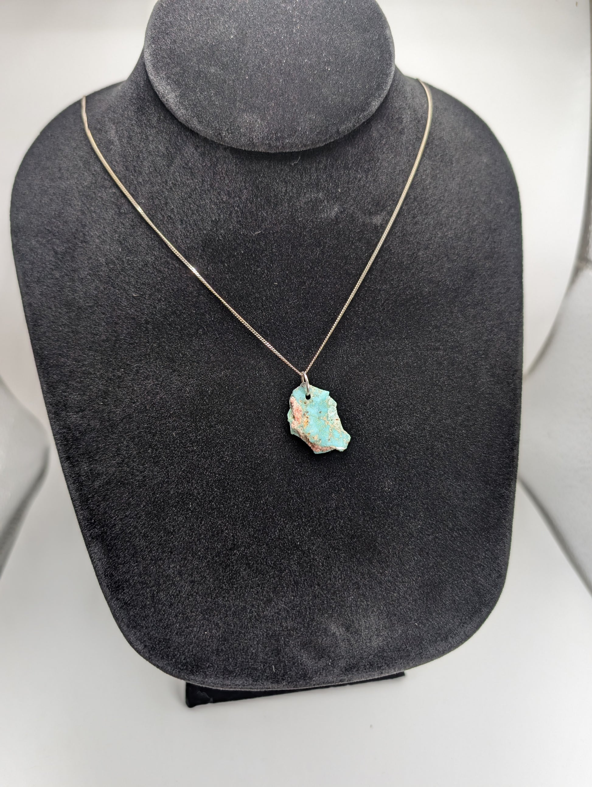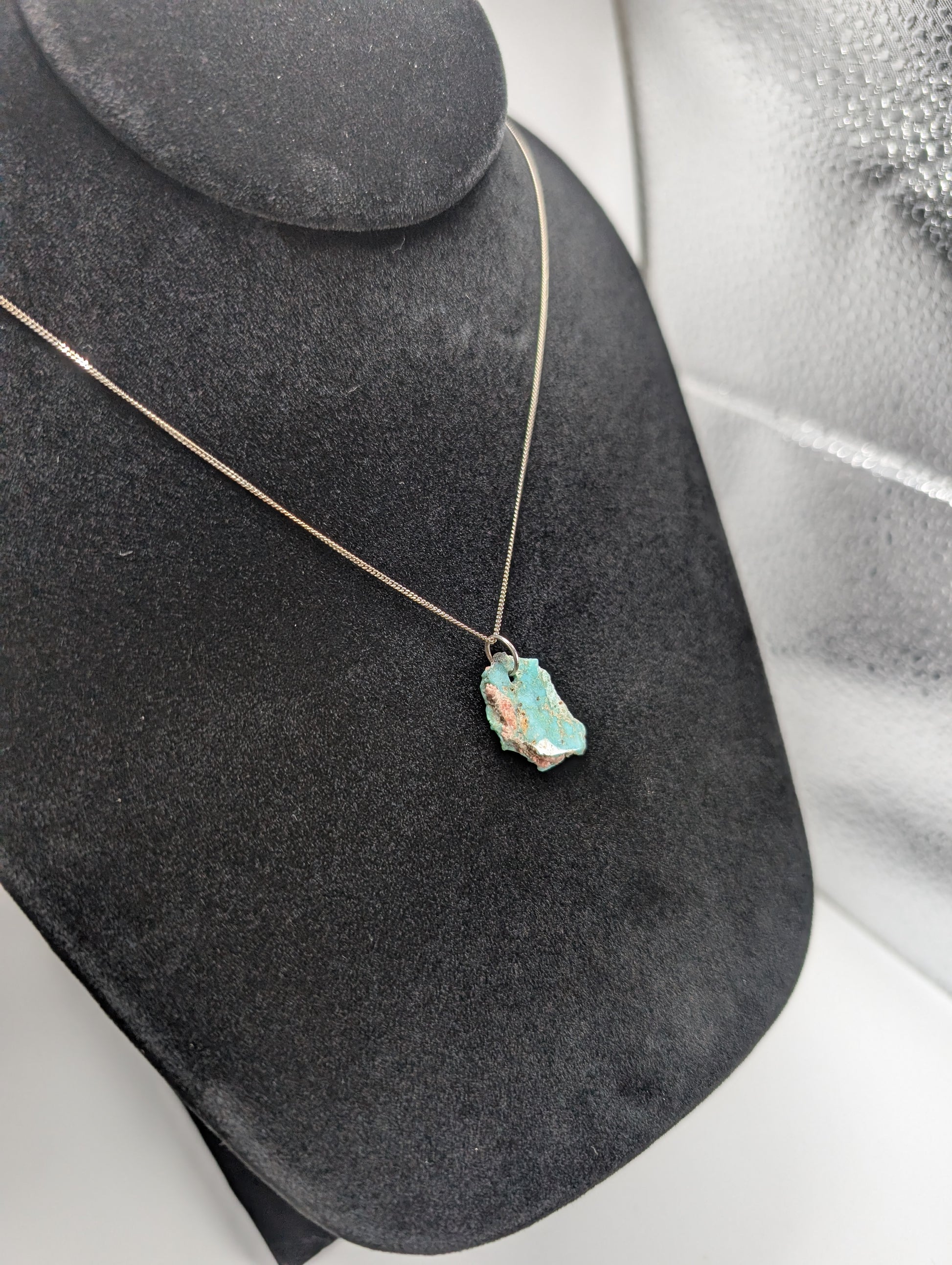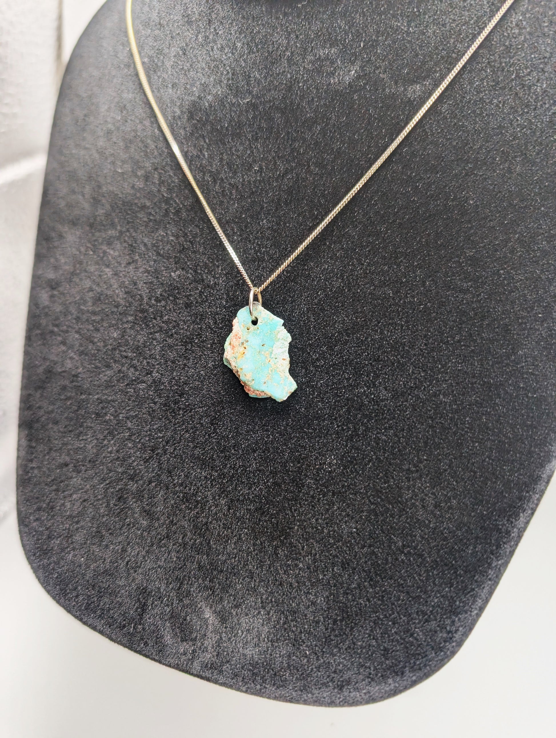 This piece features genuine turquoise from the historic King Manassa Mine near Manassa, Colorado. One side is polished to enhance its vibrant beauty, while the other remains unpolished, showcasing the stone's raw, natural character. It is elegantly set with a .925 sterling silver jump ring and chain, blending authenticity with timeless craftsmanship.