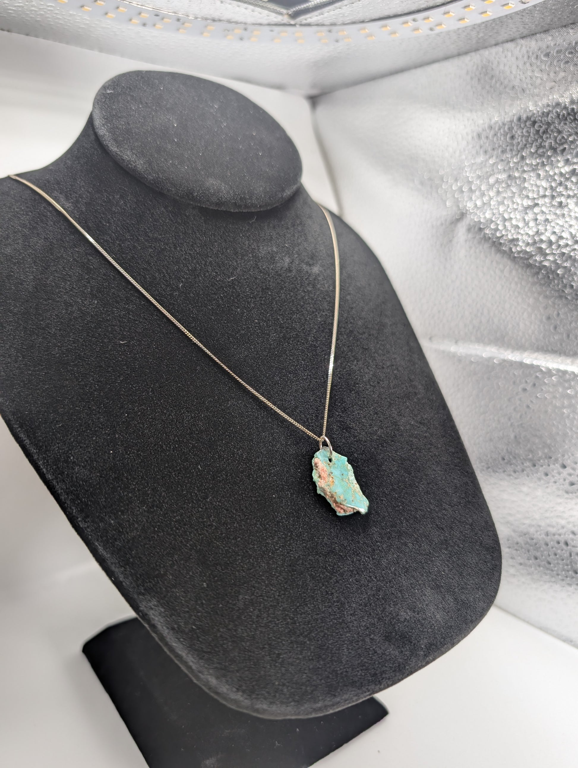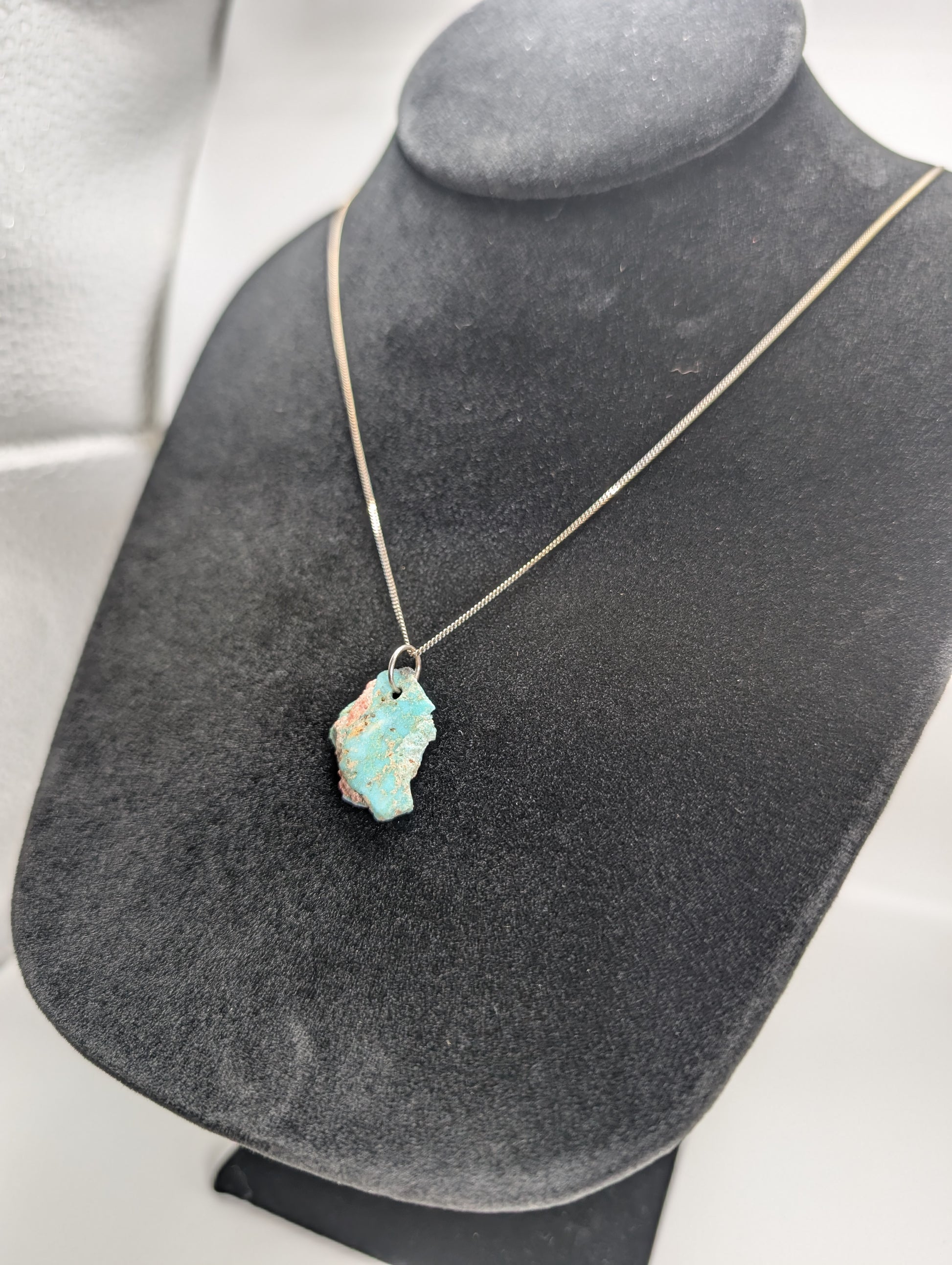 This piece features genuine turquoise from the historic King Manassa Mine near Manassa, Colorado. One side is polished to enhance its vibrant beauty, while the other remains unpolished, showcasing the stone's raw, natural character. It is elegantly set with a .925 sterling silver jump ring and chain, blending authenticity with timeless craftsmanship.