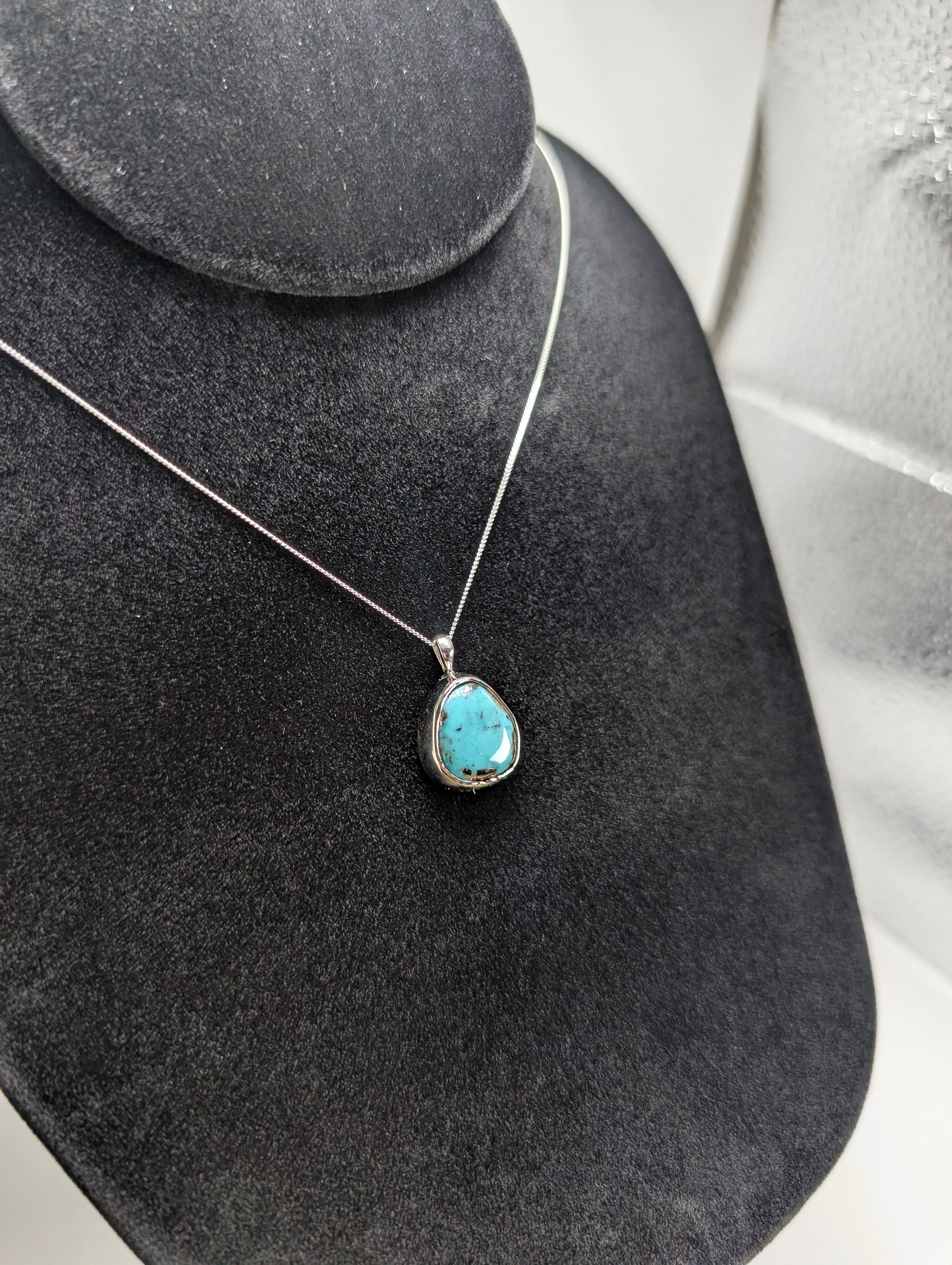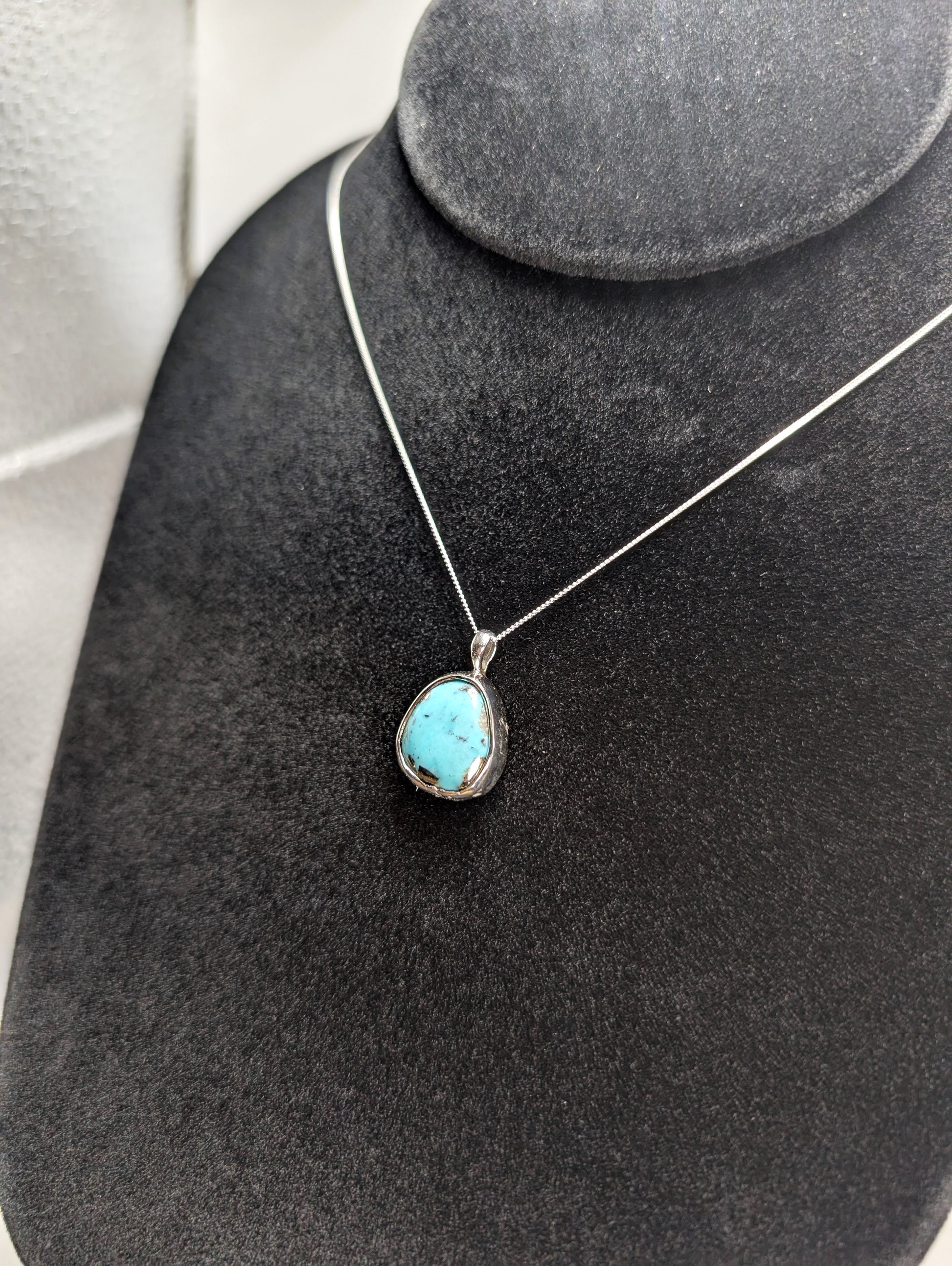 Stunning turquoise, flecked with natural gold, sourced from just outside Sonora, Mexico, set in .925 sterling silver and suspended from a matching .925 sterling silver chain.