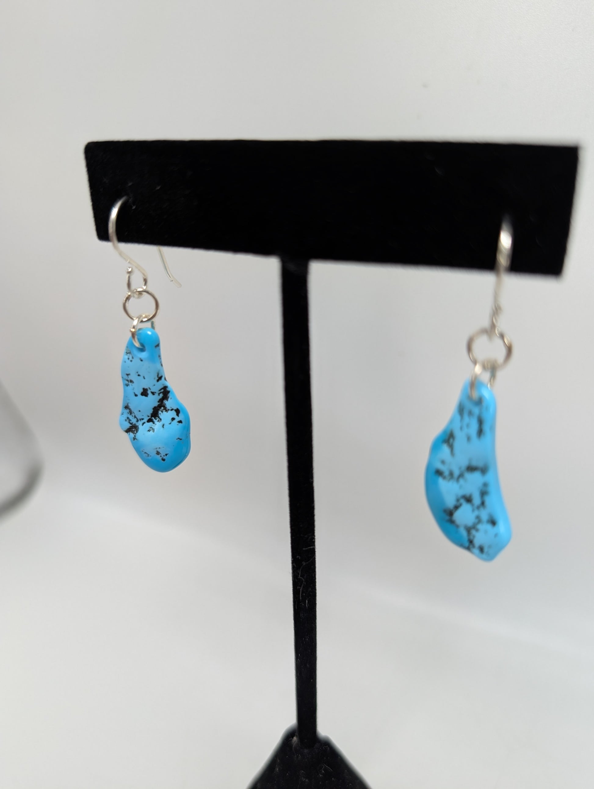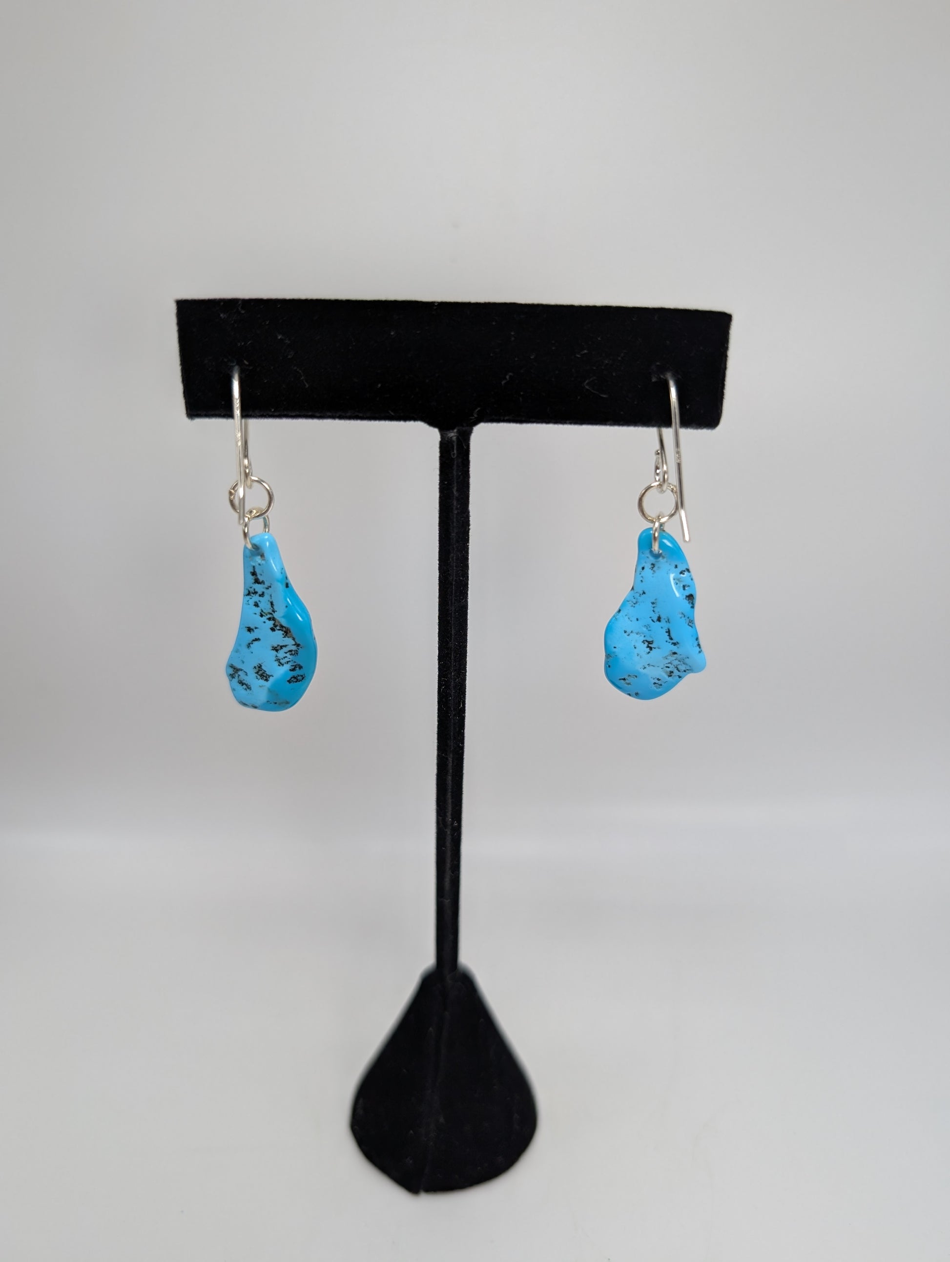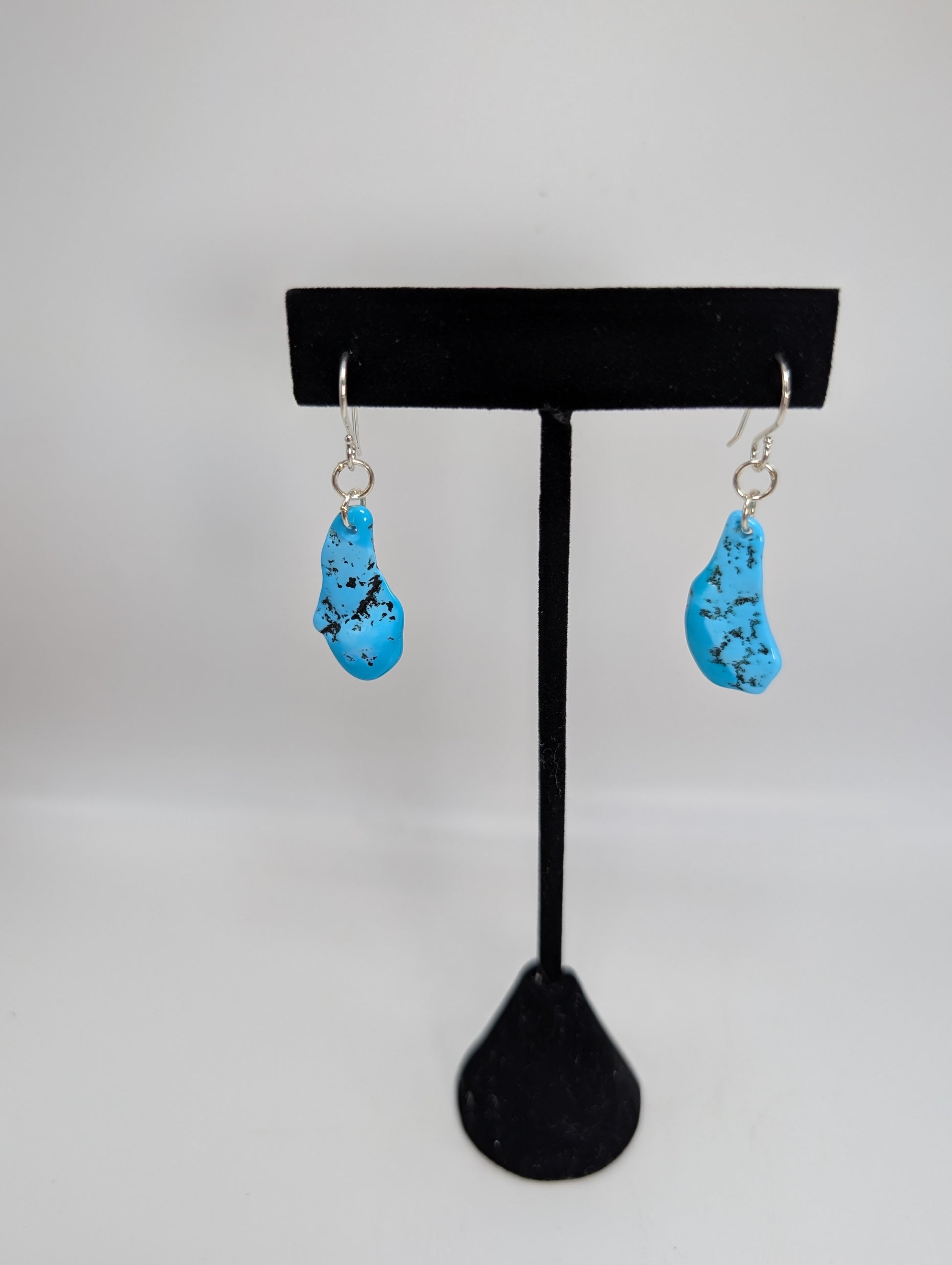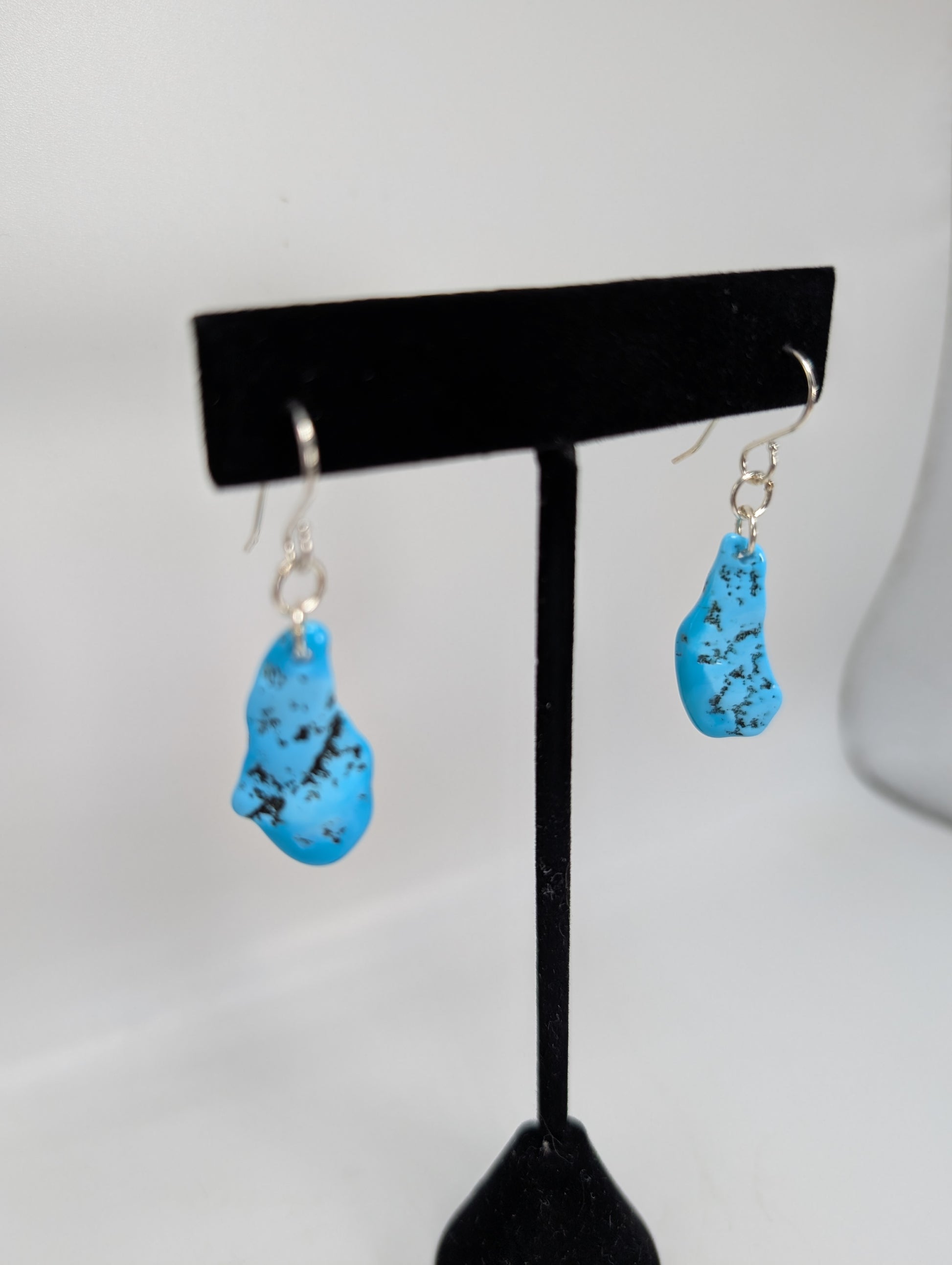 These one-of-a-kind earrings feature rare tumbled Sleeping Beauty turquoise. After low production in the 1970s, the Sleeping Beauty Mine ceased the traditional tumbling process, making these stones incredibly scarce. The turquoise was originally tumbled with shoe polish, enhancing its beautiful contrast and rich color. Each stone is set with .925 sterling silver rings and finished with classic shepherd’s hooks.
