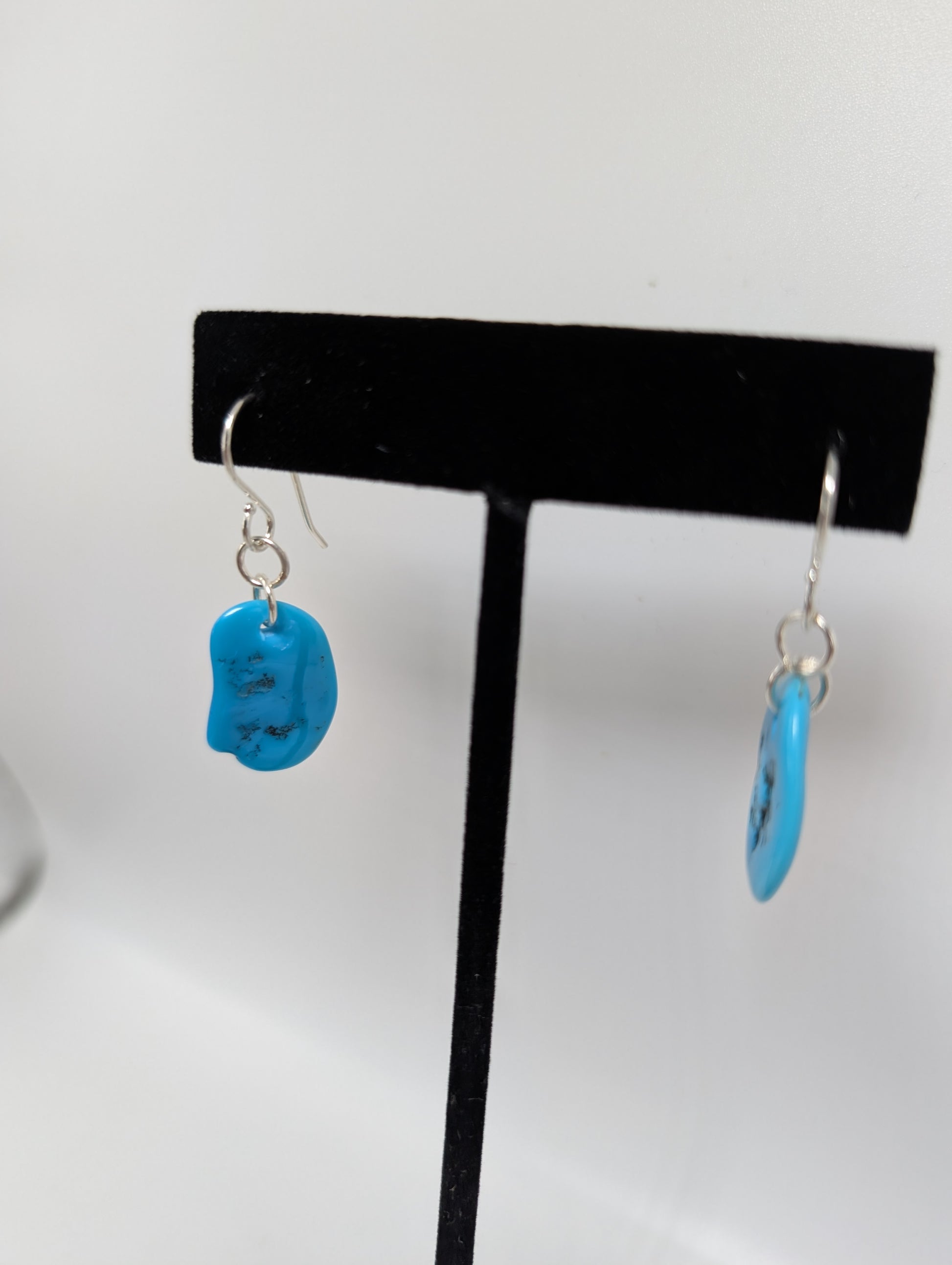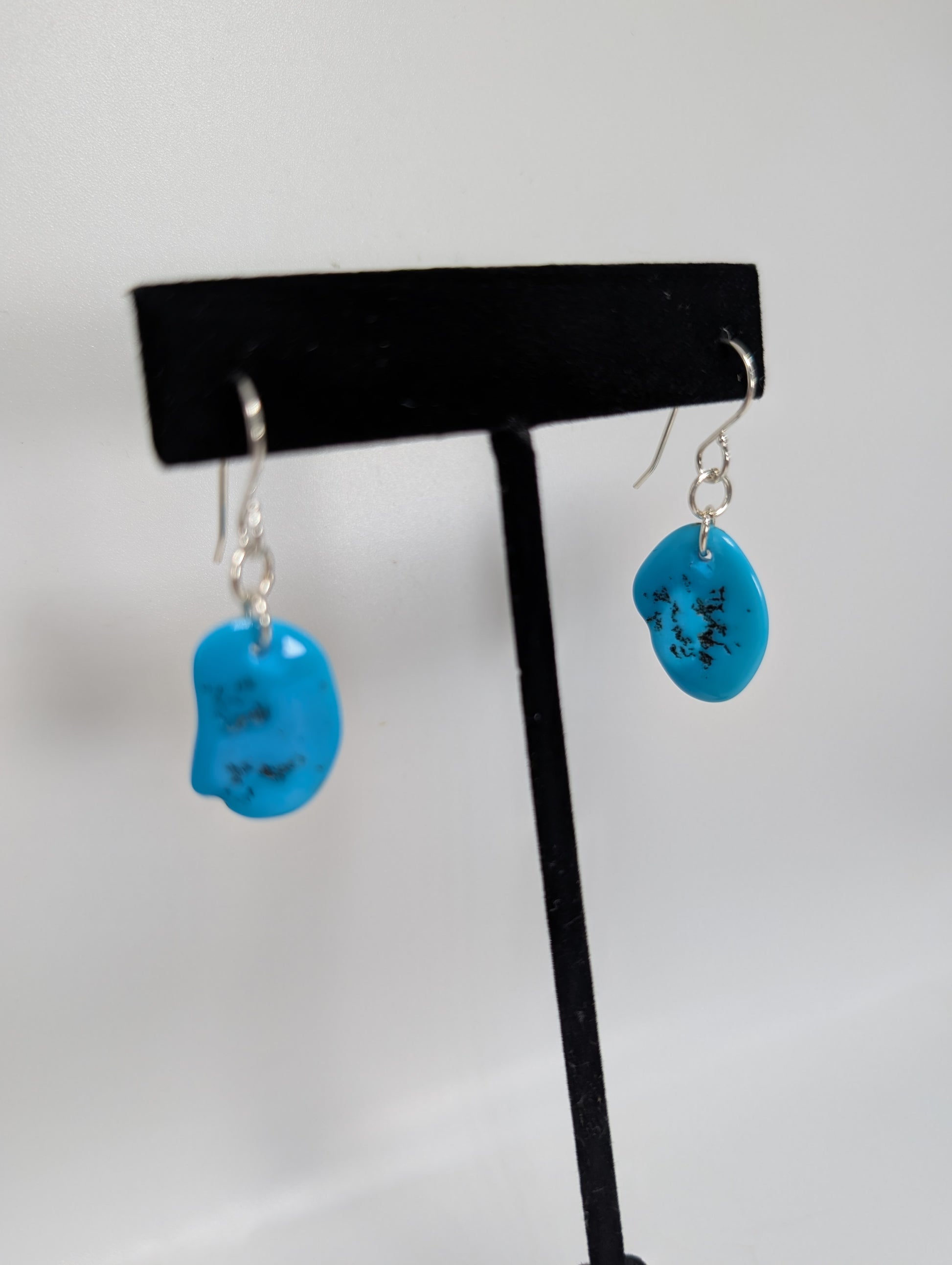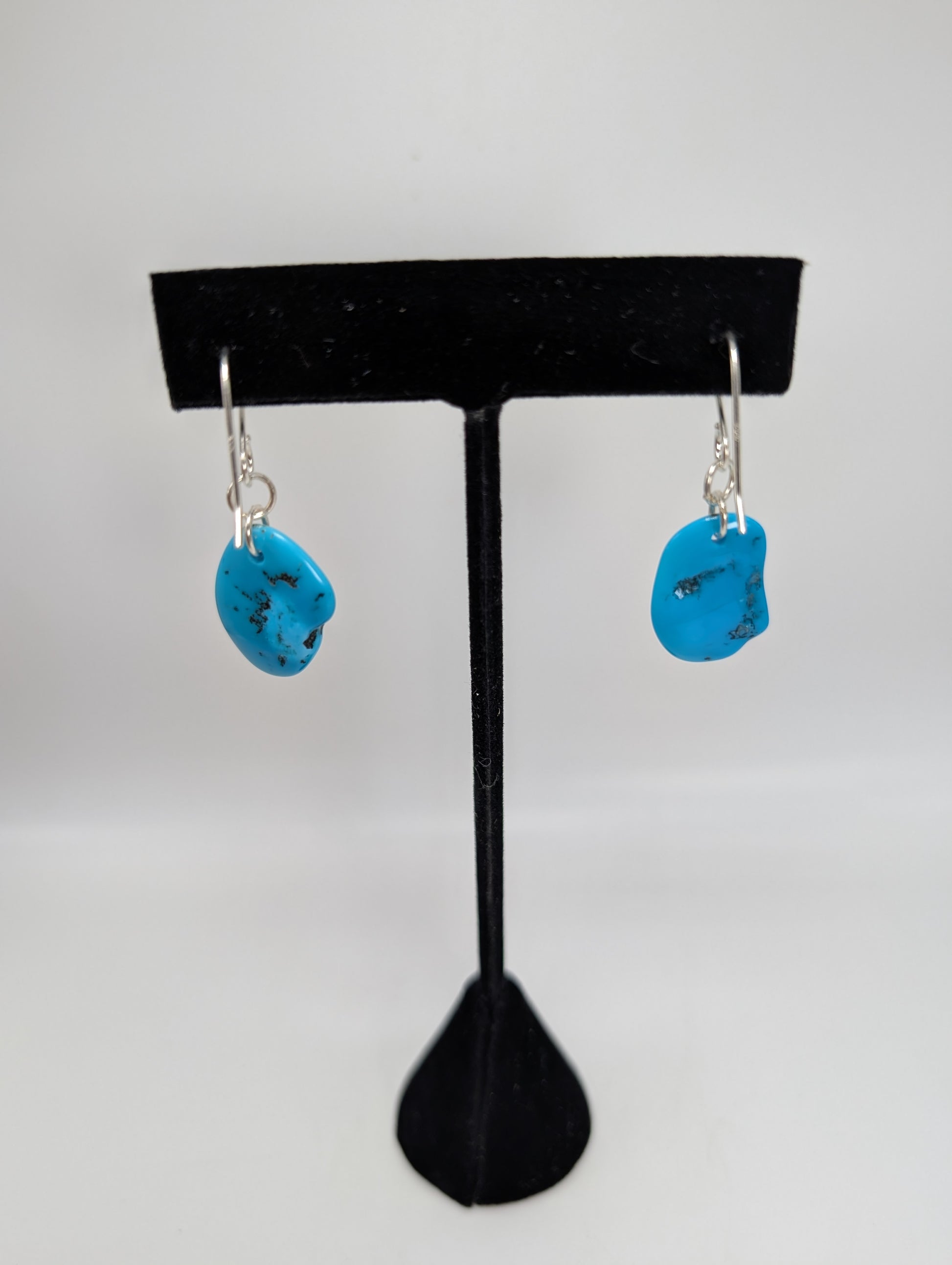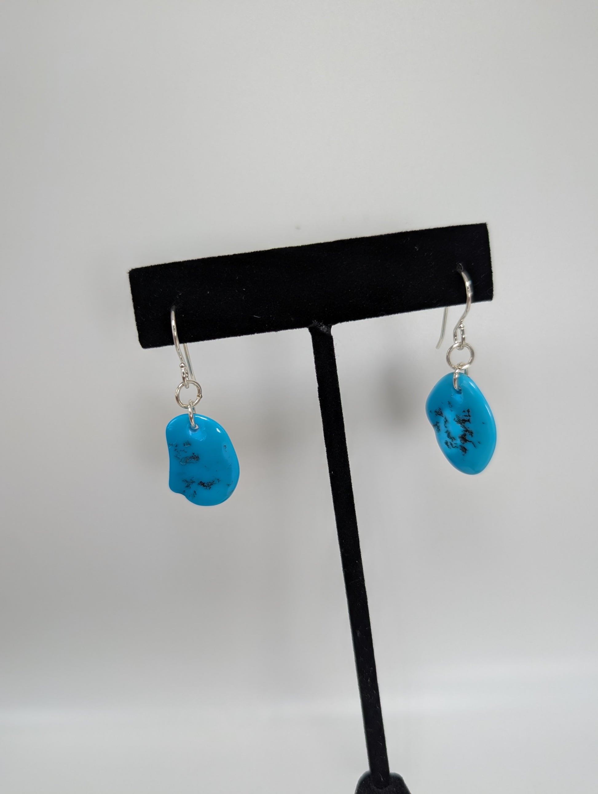 These one-of-a-kind earrings feature rare tumbled Sleeping Beauty turquoise. After low production in the 1970s, the Sleeping Beauty Mine ceased the traditional tumbling process, making these stones incredibly scarce. The turquoise was originally tumbled with shoe polish, enhancing its beautiful contrast and rich color. Each stone is set with .925 sterling silver rings and finished with classic shepherd’s hooks.